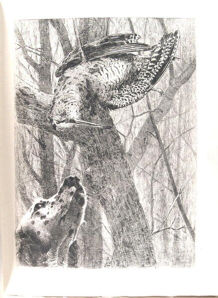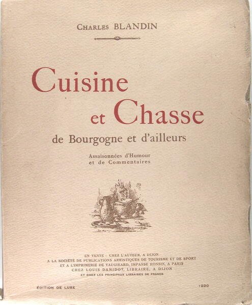 Société d’Editions artistiques de tourisme et de sport, Paris, 1920. Petit in/4 broché, couverture imprimée et illustrée d’une petite vignette, gravures, eaux-fortes, vignettes contrecollées , illustrations in-texte, lettrines historiées, 337 pages, 1ère édition. Edition de luxe, un des 550 exemplaire sur vélin d’arches numéroté, avec un envoi de l’auteur. Ouvrage dédié aux Femmes Françaises, aux Disciples de Saint Hubert, aux Touristes, aux Bibliophiles : nombreux sont donc les heureux lecteurs de ce bel ouvrage, alliant une illustration belle et variée aux savoureuses recettes et textes élaborés avec la collaboration de : Hugues Le Roux, Cunisset Carnot, Georges Tausend, . Bien complet de son eau-forte sur la bécasse.