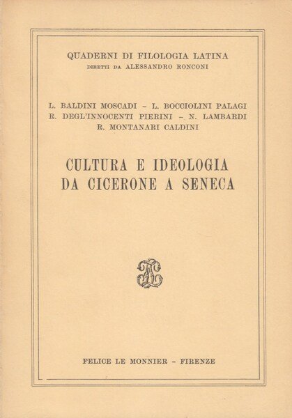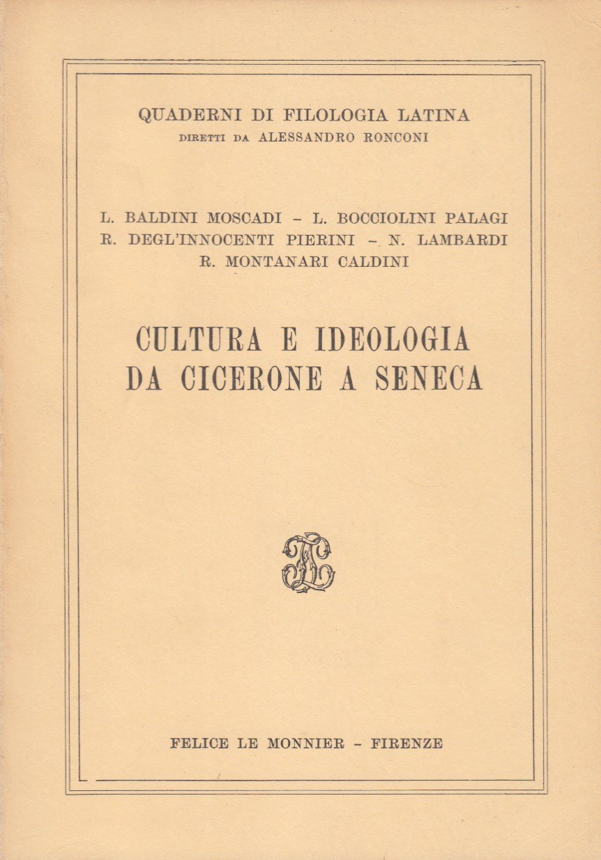 In-8 (Cm 21 x 15), pp. 175, brossura editoriale. Collana Quaderni di Filologia Latina, 1. Normali segni del tempo. OTTIMO - Scritti di: L. Baldini Moscadi, L. Bocciolini Palagi, R. Degl'Innocenti, N. Lambardi, R. Montanari Caldini.