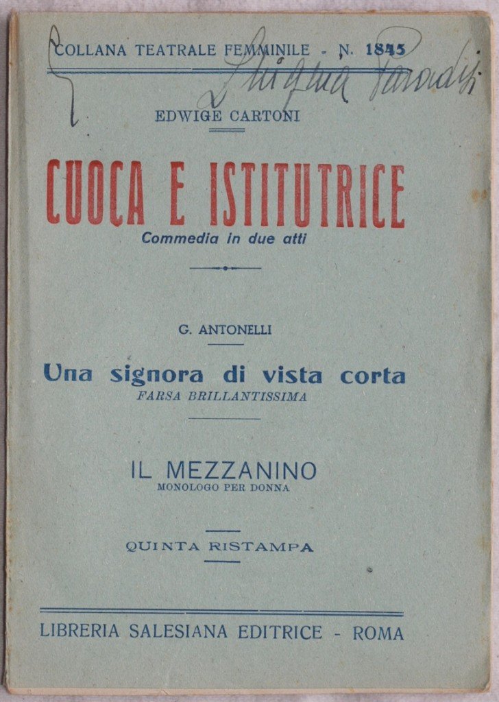 In 16. Dim. 17x12,5 cm. Pp. 63. Bel libretto d'opera del 1947 della commedia in due atti "Cuoca e istitutrice" di Edwige Cartoni e della farsa brillante "Una signora di vista corta" di Antonelli. In buone condizioni. Bella brossura editoriale illustrata. Firma al frontespizio. Brossura editoriale in buone condizioni generali con lievi usure ai margini e dorso. Legatura in buone condizioni. All'interno le pagine si presentano in ottime condizioni con rare fioriture.Beautiful booklet of 1947 of the play in two acts "Cuoca e istitutrice" by Edwige Cartoni and "Una signora di vista corta" by Antonelli In good conditions. Illustrated editorial cover. Signature in the title page. Editorial cover in good general conditions slightly worn in the edges. Binding in good conditions. Inside pages are in very good conditions with occasional foxings.