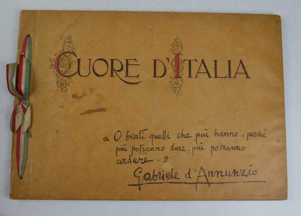 Album di cm. 36 x 25, cc. (26) interamnte illustrato prevalentemente con immegini dei regnanti. Bella legatura edit. in simipergamena con decorazioni, titoli e la scritta dannunziana: "O beati quelli che più hanno, perchè più potranno dare, più potranno ardere". Nastrino di chiusura tricolore. Perfetto stato di conservazione.