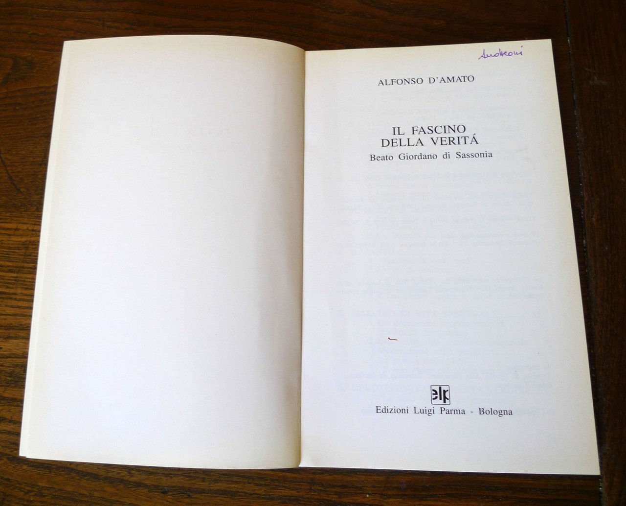 Alfonso D'Amato,IL FASCINO DELLA VERITÀ.BEATO GIORDANO DI SASSONIA.Edizioni Luigi Parma, Bologna 1991,brossura, 21x13 cm., pp.141,illustrazioni in bianco e nero,peso: g.250cod.9622CONDIZIONI DEL LIBRO: ottime,firma a penna al frontespizio,copertina e pagine leggermente ingiallite