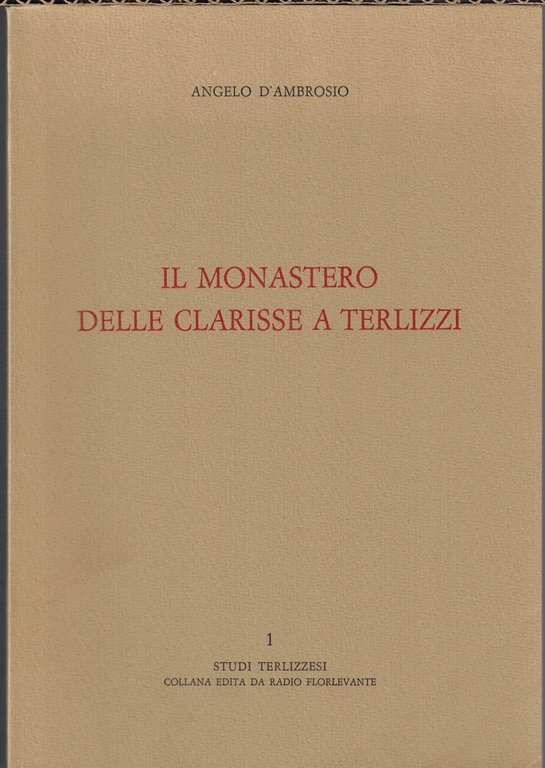 Angelo D’ambrosio, Il monastero delle clarisse a Terlizzi, Radio Florlevante, s.l. (ma stampato a Molfetta, presso la Tipografia Mezzina) 1983, pp. 79, ill. b.n., cm 25, br. ed. Collana Studi terlizzesi, n. 1. Piccola firma d’appartenenza alla prima carta. Leggere tracce d’uso, per il resto ottimo.