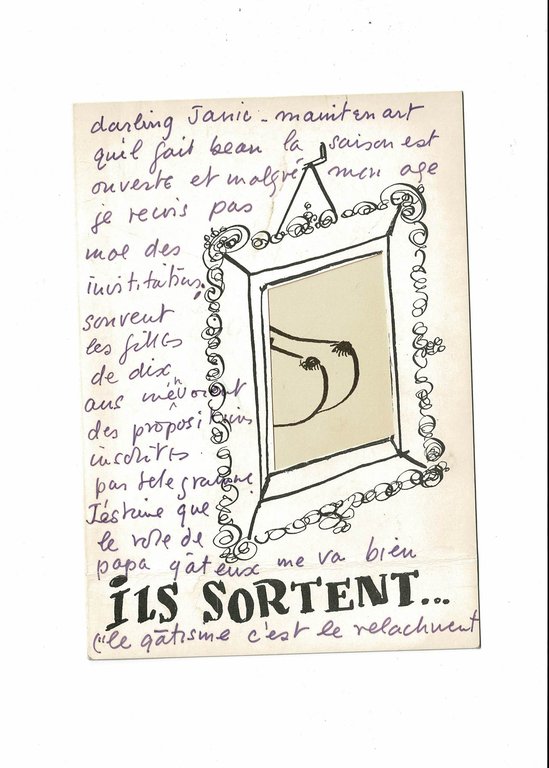Sommières 20-04-1971 | 10.50 x 14.50 cm | une carte postale et enveloppe | [ENGLISH DESCRIPTION ON DEMAND] | Carte postale autographe de Lawrence Durrell signée Dracula adressée à Jani Brun, rédigée à l'encre bleue, reproduction d'un dessin de Marcel Vaysse Ils sortent.tous les soirs, enveloppe jointe. L'écrivain nargue avec humour sa jeune amante montpelliéraine : Darling Janie - maintenant qu'il fait beau la saison est ouverte et malgré mon age je reçois pas mal des invitations; souvent les filles de dix ans m'envoient des propositions inscrites par télégramme. J'estime que le rôle de papa gâteux me va bien (le gâtisme c'est le relachment des sphinctères (Dictionnaire medicale - Pujot). Je vais en Grèce avec, une, 2, 3, 4 fille(s) plus fidé(?) que vous pour faire des reportages appellation contrôlée. D'avoir soixante ans et d'être aimé (très mal d'ailleurs) par les vampires - n'est pas que c'est splendide ? Dracula Après de nombreuses années passées en Grèce, en Egypte et à Rhodes, l'écrivain voyageur Lawrence Durrell fut contraint de fuir Chypre à la suite de soulèvements populaires qui menèrent l'île à son indépendance de la couronne britannique. Riche seulement d'une chemise et d'une machine à écrire mais auréolé du succès de son roman Bitter Lemons of Cyprus (Les citrons acides), il arriva en 1956 en France et s'établit dans le village languedocien de Sommières. Dans la « maison Tartès », sa grande demeure entourée d'arbres, il écrivit la seconde partie de son œuvre, son monumental Quintette d'Avignon, s'adonna à la peinture et reçut ses illustres amis, dont le couple Henry Miller et Anaïs Nin, le violoniste Yehudi Menuhin, l'éditeur londonien Alan G. Thomas, et ses deux filles Pénélope et Sappho. Parmi les oliviers et sous le soleil méditerranéen, il y rencontre au milieu des années 1960 la jeune et pétillante Jany (Janine Brun), montpelliéraine d'une trentaine d'années à la beauté ravageuse, qui travaillait au département des Antiquités de la Sorbonne à Paris. Elle fut prénommée « Buttons » en souvenir de leur première rencontre, où la jeune fille portait une robe couverte de boutons. Henry Miller tomba également sous le charme de « Buttons », louant sa beauté et son éternelle jeunesse dans d'exceptionnelles lettres restées inédites. Les trois compères passèrent des soirées parisiennes mémorables dont nous gardons de précieuses traces autographes à travers leurs échanges épistolaires. Recommandée par Durrell, elle fit de nombreux voyages notamment en Angleterre d'où elle reçut une vaste correspondance de l'écrivain ainsi que des œuvres d'art originales signées de son pseudonyme d'artiste, Oscar Epfs.