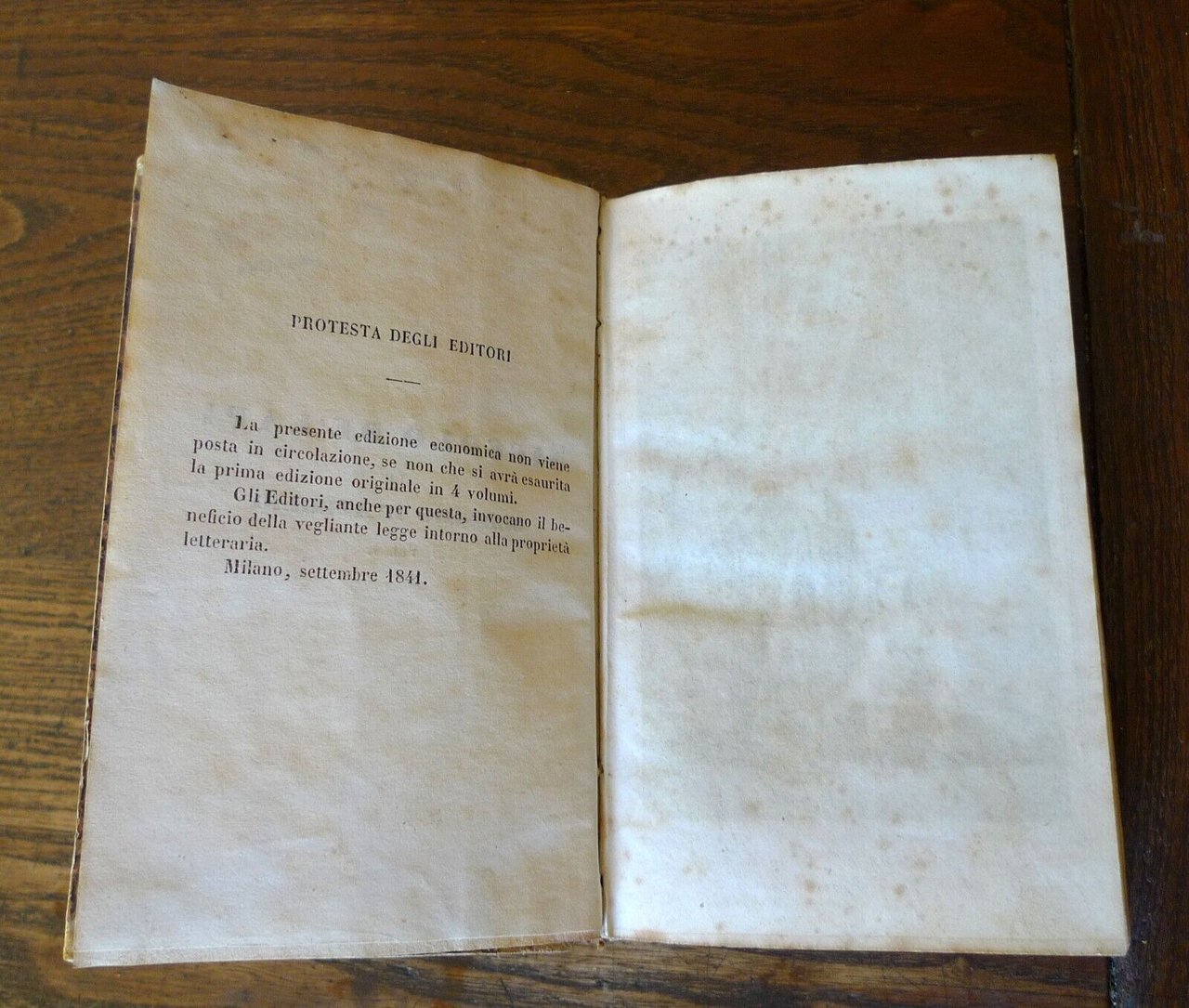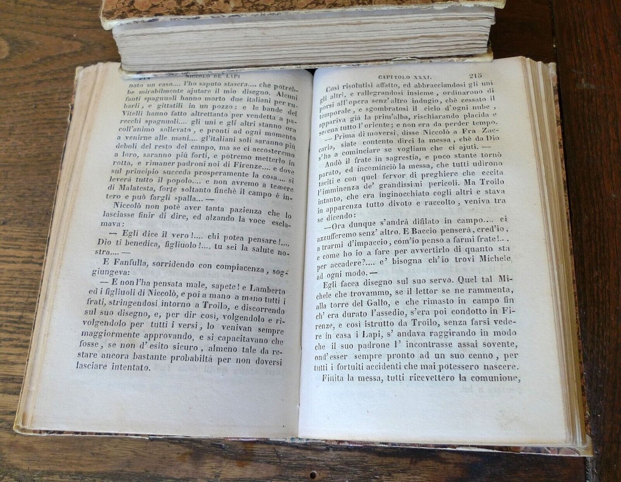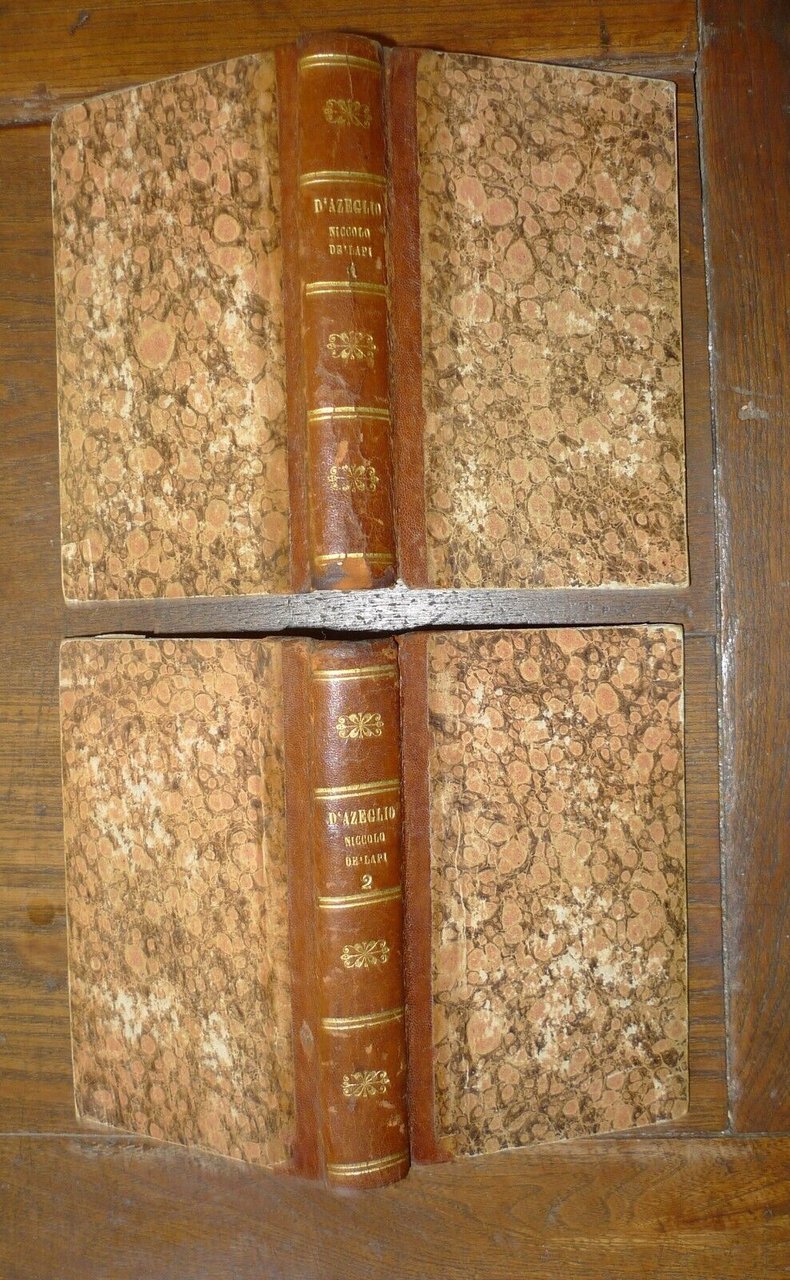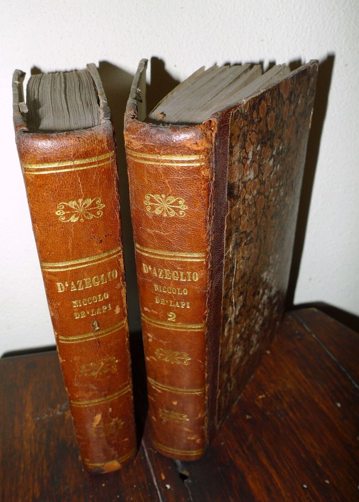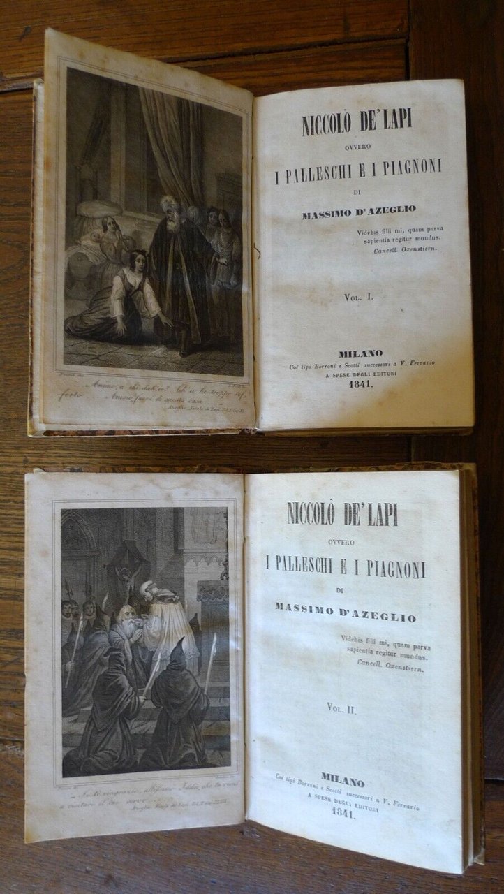NICCOLÒ DE' LAPIOVVERO I PALLESCHI E I PIAGNONIDI MASSIMO D'AZEGLIO.VOL. I.VOL. II.[2 VOLUMI, OPERA COMPLETA]MILANO,coi tipi Borroni e Scotti successori a V. Ferrario, 1841,copertina rigida, rilegatura coeva in mezza pelle,15,5x9,5 cm., pp.X-417; 426,con 2 illustrazioni all'antiporta di ciascun volume,peso: g.500