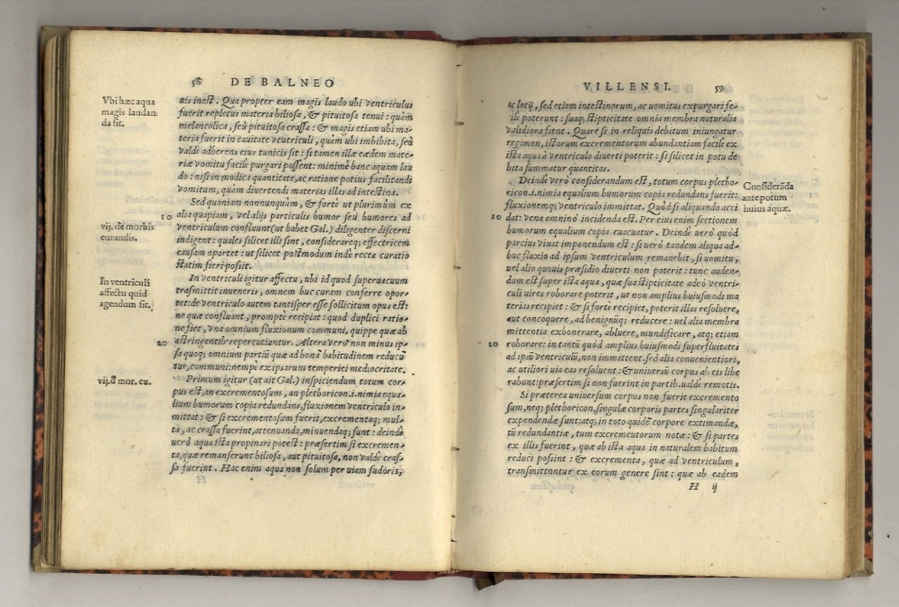 Lucae, apud Busdracum, 1552, in-4, legatura ottocentesca in mezza pelle rossa, titolo e filetti in oro al dorso, pp. 150, [2]. Con grande figura xilografica sul frontespizio e marca di Busdrago sull'ultima pagina. Prima edizione di questo ricercato testo sui Bagni di Lucca e sull'idroterapia. Condizioni molto buone.