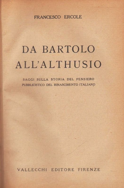 In-8°, legatura moderna in mezza tela con titolo su tassello al dorso, pp. (4)429(3). L'opera è divisa in quattro Saggi: I. Per la storia del pensiero politico medievale; II. e III. Studii sulla dottrina politica e sul diritto pubblico di Bartolo; IV. Il 'Tractatus de Tyranno' di Coluccio Salutati. Buon esemplare, ancorché brunito; non comune. Francesco ERCOLE (La Spezia, 1884 - Gardone Riviera, 1945) è stato uno storico e politico italiano, ministro dell'educazione nazionale nel governo Mussolini. Storico delle istituzioni giuridiche e del pensiero politico medievale, studiò in particolare le problematiche riguardanti il passaggio dal comune alla signoria e la nascita del principato. Noti anche i suoi numerosi studi su Dante politico, a proposito delle cui tesi intervennero con giudizi discordanti Bruno Nardi e Giovanni Gentile.