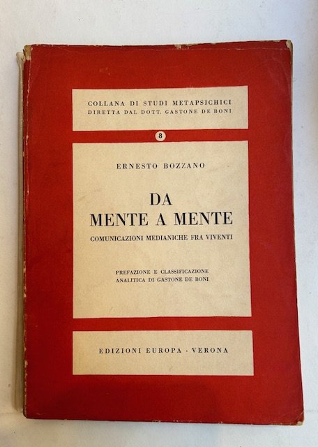 In-8°, pp. 270, (2), brossura editoriale. Alcune mancanze al dorso e ai bordi della brossura.Collana di Studi Metapsichici diretta dal Dott. Gastone De Boni. Volume 8 BOZZANO Ernesto Nato a Genova il 9 genn. 1862, si formò da autodidatta un'eclettica cultura, al cui centro era la convinzione filosofica positivistica. si accostò nel 1891 allo studio della metapsichica, tramite la rivista Annales des sciences psychiques di Ch. Richet, pervenendo, ben oltre le posizioni di questo, fino allo spiritismo. Lo influenzarono in tale senso i libri di Allan Kardec, A. Aksakov, R. Dale Owen, Epes Sargent e di molti altri sostenitori delle manifestazioni medianiche. Raggiunse la fama di uno tra i massimi cultori della scienza metapsichica, fama diffusa in molti paesi per le numerose traduzioni delle sue opere in inglese, tedesco, francese, spagnolo, romeno, greco, serbo, ecc. Esauritesi in parte le sue possibilità di lavoro per la tarda età, le condizioni di salute, la cessazione della rivista Luce e ombra e l'interruzione della corrispondenza scientifica con l'estero in seguito allo scoppio della seconda guerra mondiale, il suo discepolo Gastone De Boni, oltre a continuare l'opera col suo personale lavoro, provvide alla raccolta e all'ulteriore diffusione di vecchi scritti del B., ampliati e arricchiti in qualità. Da mente a mente è uno di questi