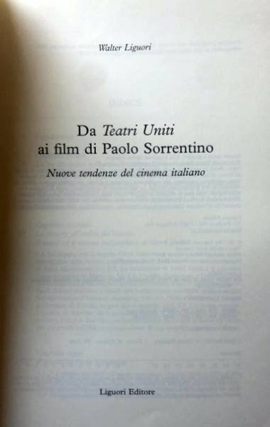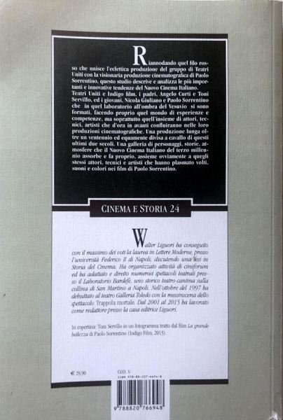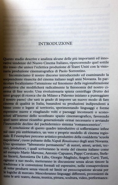 Riannodando quel filo rosso che unisce l’eclettica produzione del gruppo di Teatri Uniti con la visionaria produzione cinematografica di Paolo Sorrentino, questo studio descrive e analizza le più importanti e innovative tendenze del Nuovo Cinema Italiano. Teatri Uniti e Indigo film, i padri, Angelo Curti e Toni Servillo, ed i giovani, Nicola Giuliano e Paolo Sorrentino che in quel laboratorio all'ombra del Vesuvio si sono formati, facendo proprio quel mondo di esperienze e competenze, ma soprattutto quell'insieme di attori, tecnici, artisti che d’ora in avanti confluiranno nelle loro produzioni cinematografiche. Una produzione lunga oltre un ventennio ed equamente divisa a cavallo di questi ultimi due secoli. Una galleria di personaggi, storie, atmosfere che il Nuovo Cinema Italiano del terzo millennio assorbe e fa proprio, assieme ovviamente a quegli stessi attori, tecnici e artisti che hanno plasmato volti, suoni e colori nei film di Paolo Sorrentino.