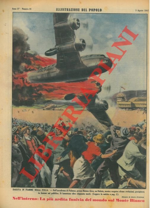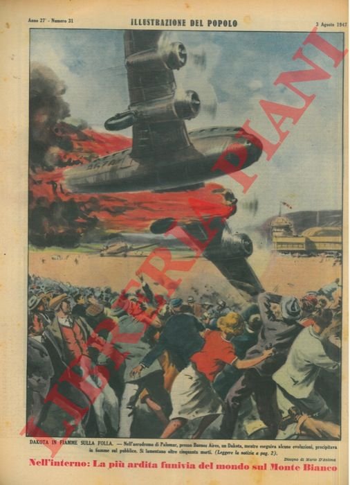 Dakota in fiamme sulla folla. Nell'aerodromo di Palomar, presso Buenos Aires, un Dakota, mentre eseguiva alcune evoluzioni, precipitava in fiamme sul pubblico. Si lamentano oltre cinquanta morti.
