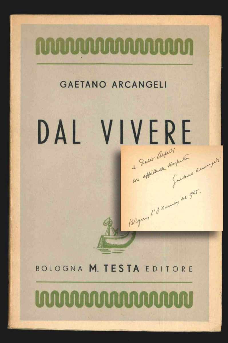 LIBROPrima edizione.CON AUTOGRAFO.Ottimo esemplare (leggera brunitura marginale alle carte, dorso lievemente scurito). Dedica autografa dell’autore: «A Dario Arfelli con affettuosa simpatia Gaetano Arcangeli Bologna l’8 dicembre del 1945» (dato il tono leggero della dedica è in realtà probabile che il libro sia dedicato allo scrittore Dante Arfelli, nato nel 1921, e non a Dario Arfelli, affermato antichista nato nel 1882); correzione autografa dell’autore a pagina 5, che emenda la «F» maiuscola di «Fratello» con una «f» minuscola.Opera prima di Arcangeli. Raccolta di poesie «riprese ed elaborate sulla linea decadente di Pascoli e D'Annunzio» e di prose «che in stile "rondesco" costruttivo e analitico presentano sequenze e paesaggi, le terre di Romagna, la via Emilia, la spiaggia adriatica, San Marino, il "medievale paesano Appennino"» (Renato Bertacchini, «Arcangeli», voce del «Dizionario biografico degli Italiani», volume 34, 1988).