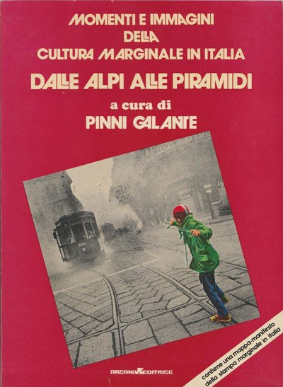 Dalle Alpi alle Piramidi è una antologia di testi tratti da alcune delle più significative testate delle stampa controculturale italiana, i brani scelti in base all'esigenza di presentare quelli di caratterre più universale e meno legati a situazioni contingenti. A metà del decennio '70, mentre scemava la spinta che aveva dato vita a fogli e riviste underground, si cominciava a fare i conti con quanto seminato negli anni precedenti. Allegata al libro una interessante "mappa-manifesto della stampa marginale in Italia". Sommario: - Cultura politica, militanza politica, marginalità e differenza - Ragione di un titolo, della scelta dei testi e altre precisazioni - Index (indice alfabetico della stampa marginale) - Il soggetto Marginale - La provocazione - Momenti della cultura marginala (droga, il pop ecc.) - Appendice Brani tratti da: Le Streghe (1972), Rosso (1972/73), Fuori! (1972/74), Fuoco (1973), Robinud (1973), Tampax (1973), Il Pane e le Rose (1973/74), L'Erba voglio (1973/74/75), Re Nudo (1973/74/75), Gatti Selvaggi (1974), La Fronda (1974), Io sono curiosa (1974), Puzz (1974), Rosa (1974), Rosso Vivo (1974), Una tazza di the (1974), Gatti Selvaggi (1974/75), A/Traverso (1975), Agaragar (1975), Muzak (suppl. 1975), Balbi 4, Il Buco, Comontismo, Good Times, Guru Cola (Stampa Alternativa), redazione di Frankenstein e altro materiale straniero. — Testi: Pinni Galante. F.to: 20,5x28; pagg. 118; rileg. brossura. Editore: Arcana Editrice, Roma, 1975.