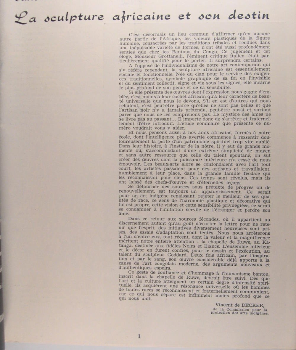 Editions grands Lacs, Namur, s.d. 1950. In/4 broché, couverture illustrée sous rhodoïde, illustrations en noir, 64 pages. Dans la boucle du Congo, l’art nègre au Congo Belge, F.Goddard , sculpteur d’Afrique, aux sources de l’Art Congolais.