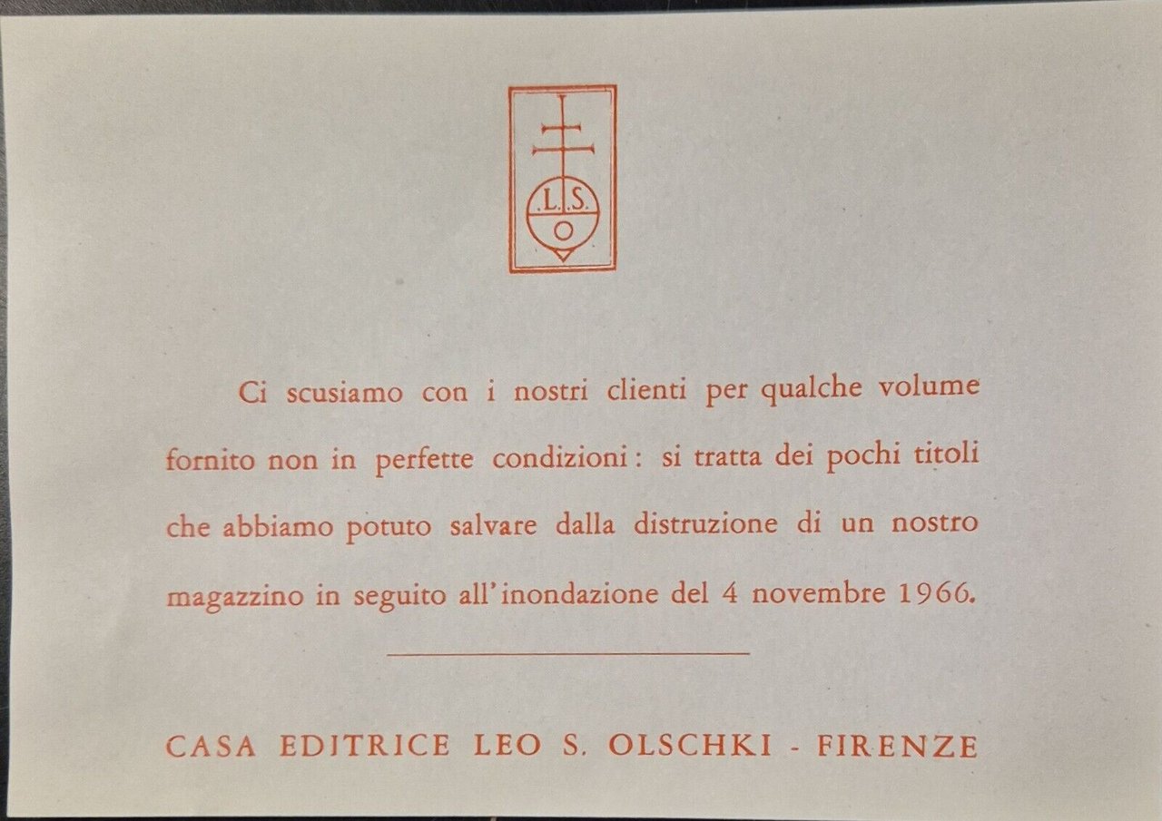 VIII, 476 + (VIII), 460 + IX, 735 pagine, figure in bianco e nero fuori testo. Conserva una rara nota stampata dell'autore testimonianza della disastrosa alluvione di Firenze del 4 novembre 1966. Copertine editoriali in brossura. Stato di conservazione: buono (pagine normalmente ingiallite, il primo ma soprattutto il secondo volume hanno le pagine un po' imbarcate dall'acqua, esemplari leggermente alluvionati a tutti gli effetti!)