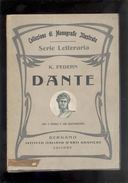 IN 8° gr.( cm.26,5 X 19 ), pp.299, COPERTINA EDITORIALE ILLUSTRATA CON TITOLO ENTRO CORNICE LIBERTY. OPERA TRADOTTA E RIFUSA DAL DOTT. CESARE FOLIGNO, CON 3 TAVOLE E 182 ILLUSTRAZIONI. IN ANTIPORTA, TESTA DI DANTE DA GIOTTO, DAI FRESCHI NEL BARGELLO DI FIRENZE. NEL LIBRO, L'AUTORE RIASSUME I RISULTATI DELLA CRITICA MODERNA INTORNO AI TEMPI, ALLA VITA E ALLE OPERE DELL'ALIGHIERI - UN LAVORO DI COMMENTO. OPERA FACENTE PARTE DELLA COLLEZIONE DI MONOGRAFIE ILLUSTRATE, SERIE LETTERARIA.VECCHIO SEGNO DI SCOTCH NELLA PARTE BASSA DEL PRIMO PIATTO, MINIME MANCANZE NEL PIEDE E NELLA TESTA DEL DORSO, ALTRIMENTI OTTIMA CONSERVAZIONE GENERALE. CARTA PATINATA. ID 4676