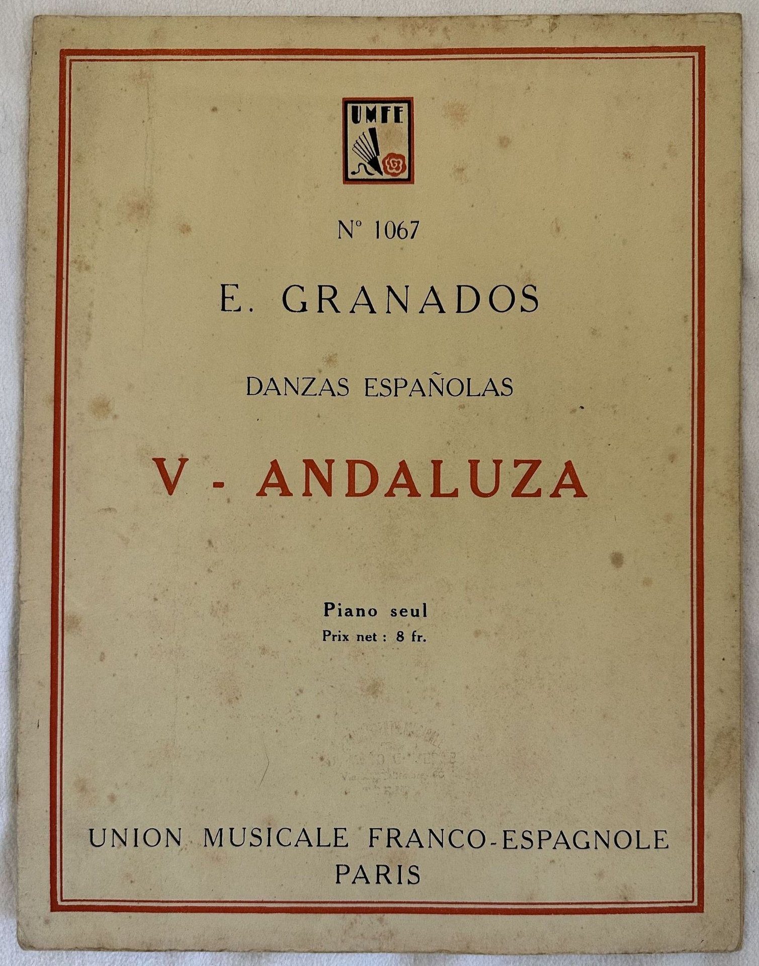 Edizione del 1929 della melodia "Danzas Espanolas" del compositore e pianista spagnolo Enrique Granados (1867-1916). In ottime condizioni. Copertina editoriale in ottime condizioni con lievi usure marginali. Legatura in buone condizioni. Pagine in ottime condizioni con rare fioriture. In folio. cm. 32x24,5. Pp. 6.Edtion of 1929 of the melody "Danzas Espanolas" by by the spanish composer and piano player Enrique Granados (1867-1916). In very good conditions Editorial cover in very good conditions lightly worn in the extremities. Binding in good conditions. Pages in very good conditions with occasional foxing. In folio. cm. 32x24,5. Pp. 6.<BR><BR>