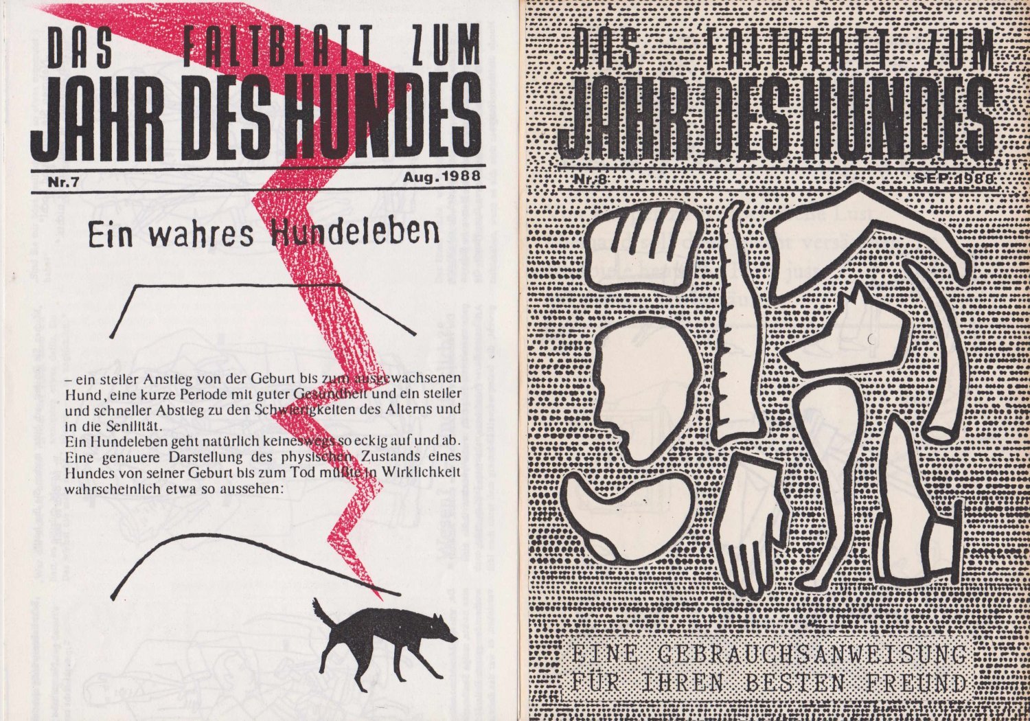 Faltblätter mit monochromen Illustrationen, jedes auf unterschiedliche Art gefaltet. Nr 7, Aug. 1988: Ein wahres Hundeleben. Nr 8, Sep. 1988: Eine Gebrauchsanweisung für Ihren besten Freund. Nr 9, Okt. 1988: Majakowski ist Kläff. Nr 10, Nov. 1988: Die Hundemacherin. Nr 11, Dez 1988: Der Kunsthund. Letzte Nummer: Der letzte Hund. ################## LIEBE KUNDEN, WIR MACHEN UNSERE JÄHRLICHE FRÜHLINGSAKTION MIT 30% RABATT AUF DEN GESAMTEN BESTAND. DIE ERMÄSSIGUNG GILT AB SOFORT, DER RABATT WIRD NACH IHRER BESTELLUNG VON DEN PREISEN ABGEZOGEN UND SIE ERHALTEN DEN ENDBETRAG VON UNS. ÜBER IHR INTERESSE AN UNSEREN SELTENEN STÜCKEN WÜRDEN WIR UNS WIE JEDES JAHR SEHR FREUEN ###################