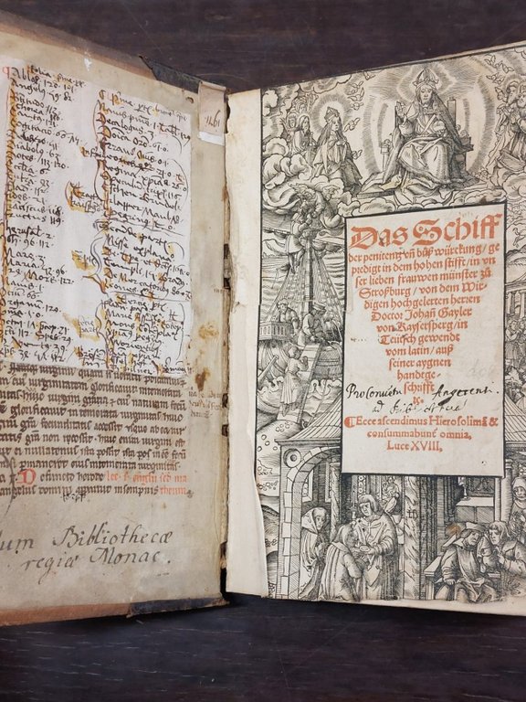 <span style="font-style: normal;">In-4° (cm. 24), cc. [1] 129 [3] con frontespizio figurato in xilografia di Leonhard Beck che racchiude il titolo tipografico in rosso, e una grande crocifissione a piena pagina sempre in xilografia di Hans Schäufelein in fine; piccole mancanze ai bordi di qualche carta ma con fastidio ai soli margini delle due illustrazioni, minuscoli forellini di tarlo in fine. Postincunabolo in affascinante e genuina legatura coeva in mezza pelle su assi di legno dolce (priva del piatto posteriore); alla controguardia un suggestivo manoscritto probabilmente anteriore al XIII secolo che riguarda un sermone di Sant'Agostino (CLXXV vigilia dell'Epifania), su cui è applicato un cartellino con indice degli argomenti del libro stilati da mano coeva. Antica nota manoscritta sempre al contropiatto che ripete il timbro al </span><i>verso</i><span style="font-style: normal;"> del frontespizio «Duplum Bibliothecae R. Monac.» ovvero della Biblioteca Regia di Monaco di Baviera; antica nota di appartenenza al titolo. Prima edizione completa in lingua tedesca de </span><i>La Nave dei Penitenti</i>, importante e gustosa opera dell'imaginifico predicatore strasburghese nato a Sciaffusa, ispirata al noto poema allegorico <i>La Nave dei Folli</i> di Brant. Le sue prediche frizzanti, sferzanti, satiriche e oggi quasi buffonesche finirono solo successivamente all'Indice perché sfruttate dai riformati nelle battaglie anticattoliche (in realtà Geiler disprezzava le riforme conciliari perché principio di confusione). «Sermoni gustatissimi dalla folla» [E.C. V, 1979]. Esemplare di grande suggestione. (SA5)