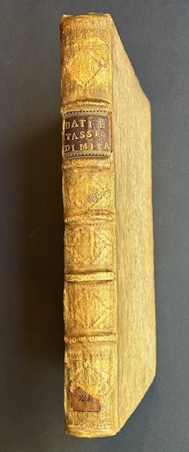 In folio (287 x 195 mm), pp. [12], 312; 38, stemmi xilografici ai frontespizi, legatura coeva in piena pergamena, dorso a 5 nervi, titolo in oro su tassello. Bella copia in affascinante legatura coeva, assai fresco. Raro, solo tre copie censite nelle biblioteche italiane. Verri nel libro 'Memorie sulla economia pubblica dello Stato di Milano più volte cita questa opera, di seguito alcuni punti salienti: 'Le tariffe non erano più considerate come una parte essenziale della legislatione, ma semplicemente si risguardavano come un espediente per cavare il danaro dalle mani del Popolo. S’è veduto come nel secolo antecedente si accrescessero i tributi delle tariffe più d’una volta e senza distinzione alcuna si aggravassero le interne manifatture; in questo secolo XVII sempre più s’accrebbe questa rovina. Una gabella s’impose all’uscita de’ nostri panni e un’altra gabella s’impose alla introduzione della seta in Città. Così si ferirono i principj più limpidi della economia politica e sulla manifattura perfezionata e sulla materia prima. Nuove gabelle s’eressero col nuovo monopolio dell’indigo, droga di cui si fa tanto uso nella tintura, e col dazio della vallonia che serve alla preparazione de’ cuoj. Si accrebbero tutti in un colpo i dazj di tutte le mercanzie di un terzo, cosicchè la mercanzia che pagava 9 si aggravò del peso di 12. Ciò avvenne nel 1614, epoca veramente funesta la quale i scritti de’ nostri Commercianti molto dolorosamente hanno rammentata dappoi. Ma sebben grandi fossero questi errori delle tariffe e rovinosi, d’un altro ancora più fatale mi resta da far menzione. Il disordine giunse a segno che le tariffe non furon più un codice conosciuto dal Popolo, divennero un arcano, e gl’Impresarj e Gabellieri furono fatti dispotici Legislatori ed esecutori delle estorsioni che arbitrariamente facevano al passaggio di tutte le mercanzie.'. 'Qualche buona operazione che si fece in que’ tempi, tale si fu l’abolire il monopolio della vallonia, droga inserviente a preparare i cuoj,161 che s’era voluto erigere 27 anni prima. Ordinò la Corte che si abolisse il dazio sulla introduzione della seta greggia: ciò fu con Reale Dispaccio del 1681 21 aprile, al quale ordine si diede esecuzione poi 58 anni dopo,162 tanta era la lentezza con cui si ubbidirono gli ordini più benefici del Sovrano. Si pose qualche freno alla licenza de’ Gabellieri, stampandosi finalmente nel 1686 un libro di tariffe intitolato Dati e tasse diverse. Ma questi lenti e poco vigorosi provvedimenti non potevano ridare la vita all’industria d’un popolo oppresso radicalmente dalla legislazione e dal disordine d’ogni politica economia'. 'L’industria nazionale non più restò protetta dalle tariffe. Si accrebbero replicatamente i tributi delle gabelle prima del 1555, poi nuovamente nel 1558.60 Indistintamente si aggravarono i panni fabbricati in Paese e tutte le manifatture nostrali: «Plus on se ruine plus il devient indispensable de se mieux ruiner», dice il Sig.r Marchese di Mirabeau,61 e la sperienza lo dimostra'.