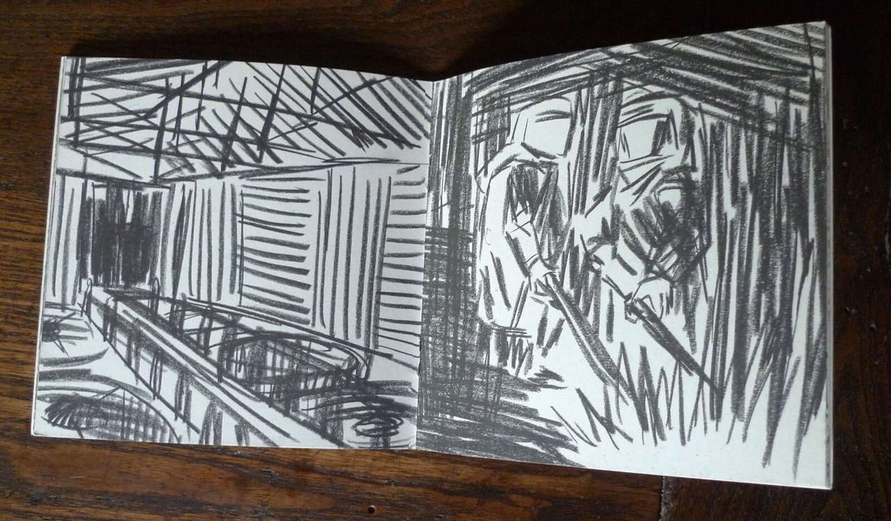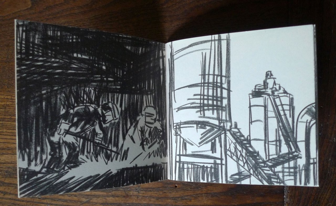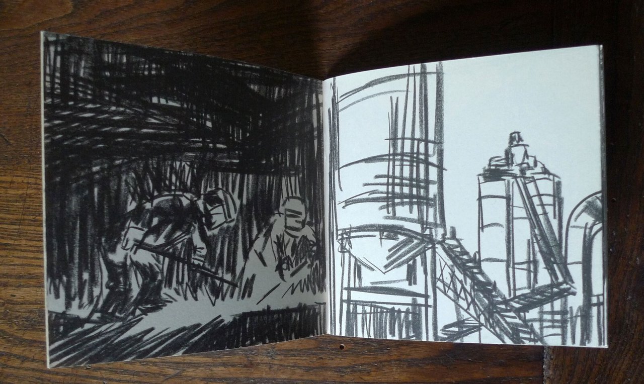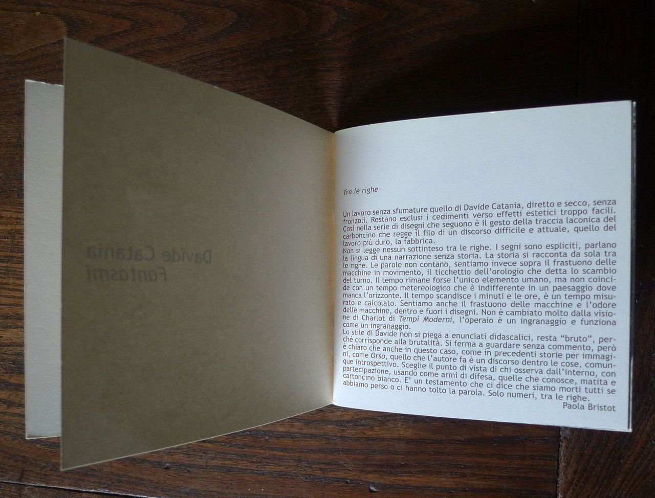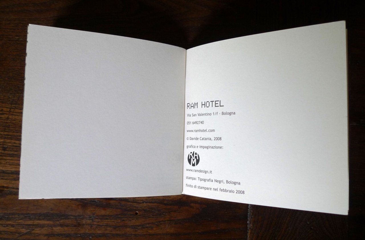 Davide Catania,FANTASMI.Galleria RAM HOTEL, Bologna 2008,brossura, rilegatura con punto metallico,13,5x13,5 cm., pp.32 non numerate,illustrazioni in bianco e nero,peso: g.250cod.9404CONDIZIONI DELL'OPUSCOLO: come nuovodal comunicato stampa:RamHotel presenta "Fantasmi", esposizione di disegni originali di Davide Catania.Davide Catania, nato a Catania nel 1977, è un giovane artista del fumetto che fa parte del gruppo di autori che ha dato vita alla rivista Canicola. www.canicola.netHa pubblicato fumetti per "Schizzo", "Nonzi", "Biblia", "Glomp" e "Internazionale". Disegni con "Lo Straniero" e per Pezzi (Edizioni Interculturali, 2005). Ha realizzato l'albo 040100 (Centro Fumetto Andrea Pazienza, 2001), la fanzine on-line Ogre [ogre.altervista.org], oltre a diverse autoproduzioni come Il raggio della morte (Canicola, 2004) e Rovineremo la festa (Canicola, 2005). Vive a Milano.Fra gli altri originali esposti, una serie di venti disegni ispirati ai temi della fabbrica e del mondo operaio, che verranno raccolti nel nuovo catalogo Ramhotel, preceduti da una introduzione di Paola Bristot."Un lavoro senza sfumature quello di Davide Catania, diretto e secco, senza fronzoli. Restano esclusi i cedimenti verso effetti estetici troppo facili. Così nella serie di disegni che seguono è il gesto della traccia laconica del carboncino che regge il filo di un discorso difficile e attuale, quello del lavoro più duro, la fabbrica." ... "Non è cambiato molto dalla visione di Charlot di Tempi Moderni, l’operaio è un ingranaggio e funziona come un ingranaggio." /Paola Bristot/