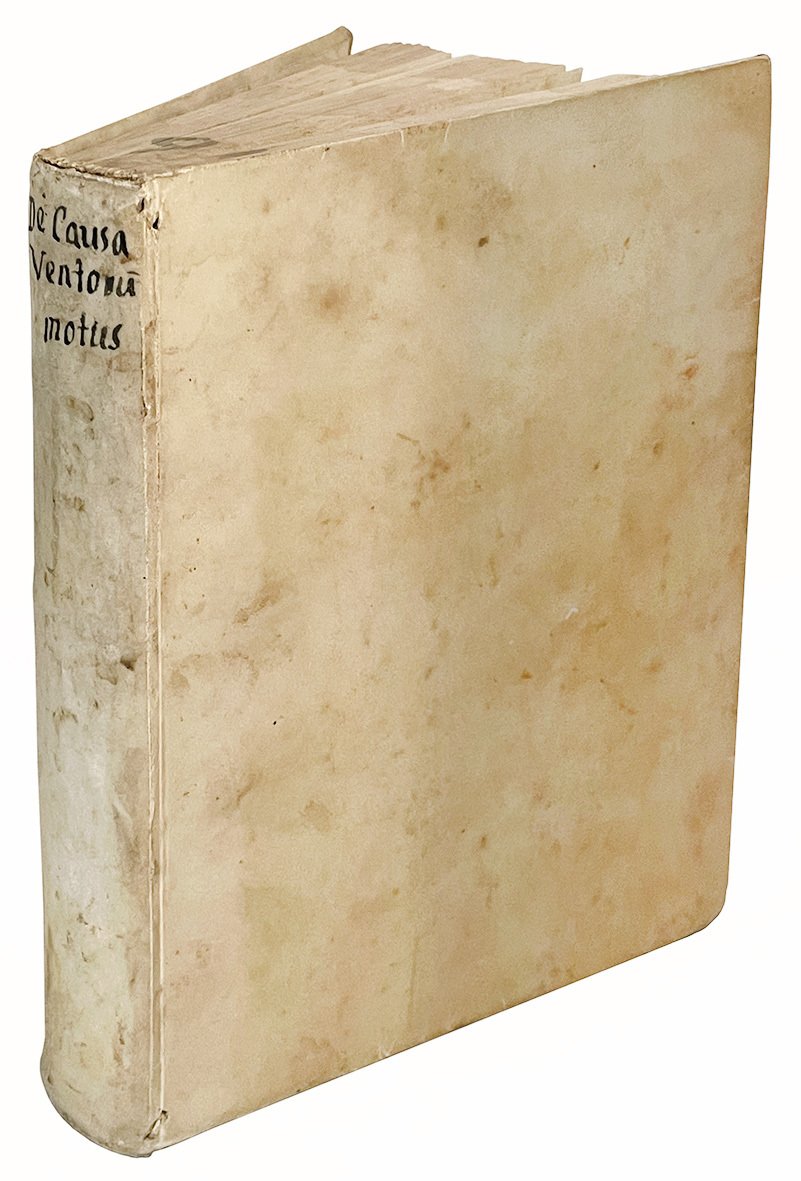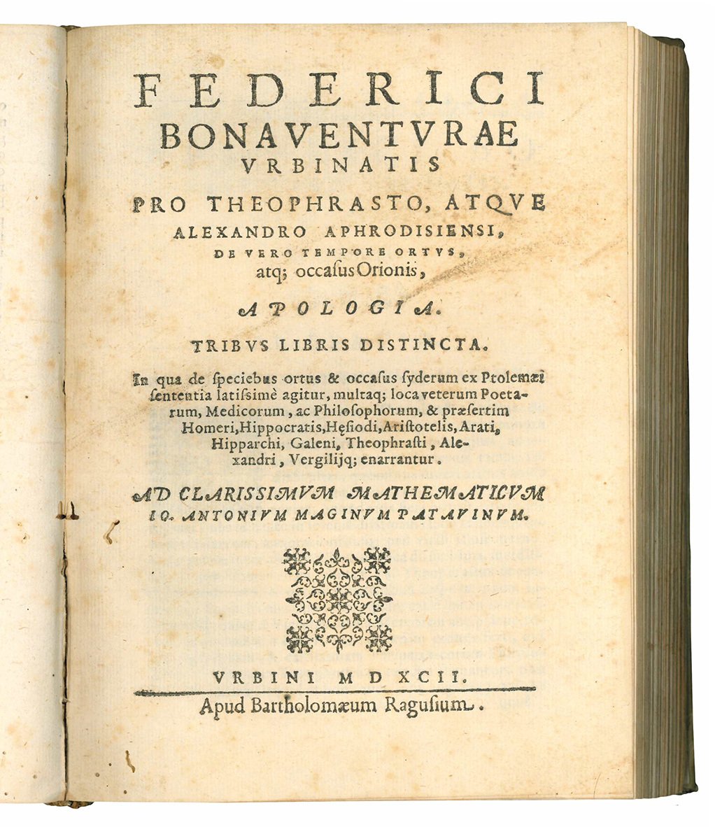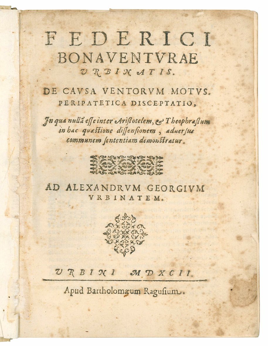 First editions. Bonaventura's first datable work is a version of Temistius' paraphrase of Aristotle's De anima (books 2 and 3 appeared in 1582-83, book 1 in 1588). Later he devoted himself to works of erudition on ancient astronomical and meteorological texts, publishing in Urbino in 1592, at Bartolomeo Ragusio's press, the In errantium stellarum apparitiones ac significationum collectio of Ptolemy (with parallel texts by Pliny and Columella, and an extensive commentary), an Apologia in favor of Theophrastus and Alexander of Aphrodisia De vero tempore ortus atque occasus Orionis, written in Italian and turned into Latin by Pier Paolo Florio, a De causa ventorum motus to support in almost two hundred pages the concordance in the matter between Aristotle and Theophrastus. The following year, always in Urbino, he published the first and only part of his Anaemologia […] de affectionibus, signis, causisque ventorum, which provided in sixty pages the amended text of De ventis and other meteorological writings of Theophrastus, followed by nearly four hundred pages of scholarly commentary. All these prints, remained unsold, were then put back into the market in Venice in 1594, with a changed title page, by F. de' Franceschi, with no better avail (L. Firpo, Bonaventura, Federico, in: “Dizionario Biografico degli Italiani”, XI, 1969, s.v.).