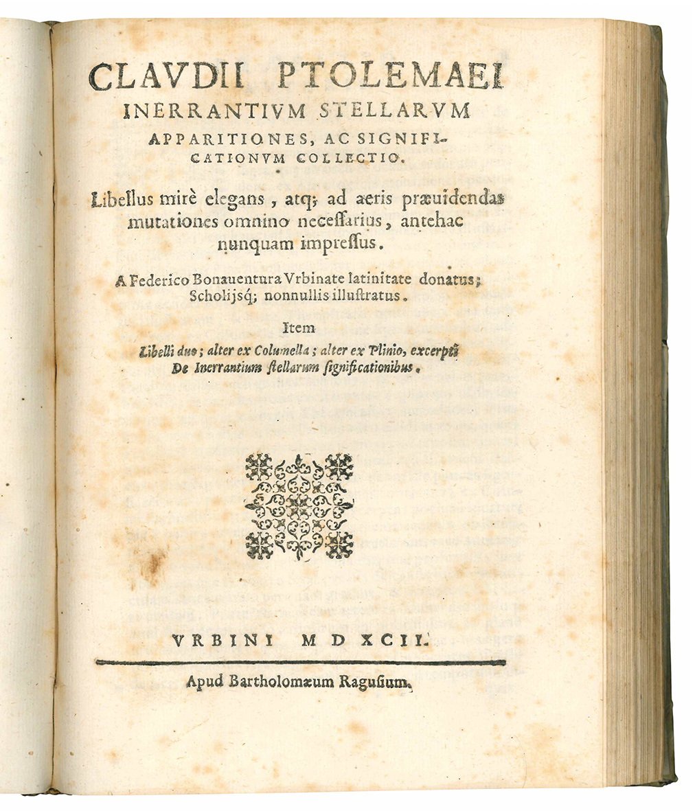 PTOLOMAEUS, Claudius (100-178)-BONAVENTURA, Federico ed. (1555-1602). Claudii Ptolemaei In errantium stellarum apparitiones, ac significationum collectio. Libellus mirè elegans, […] A Federico Bonaventura Urbinate latinitate donatus; scholijsque nonnullis illustratus. Urbino, Bartolomeo Ragusi, 1592.