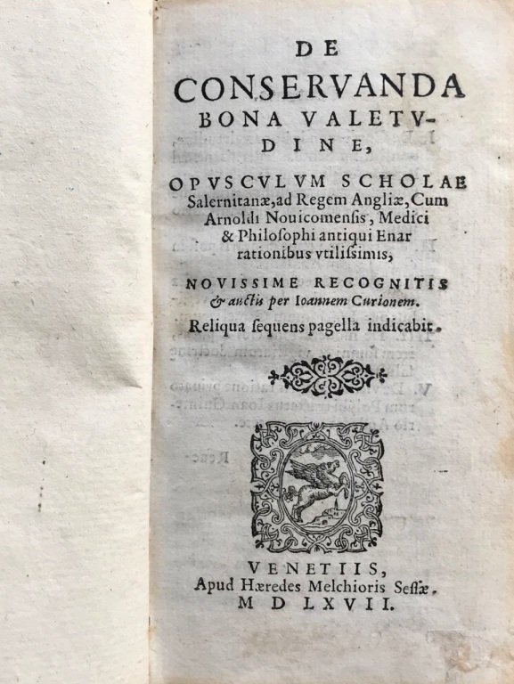 De conservanda bona valetudine, opuscolum Scholae Salernitanae, ad Regem Angliae, cum Arnoldi Novicomensis, medici et philosophi antiqui enarrationibus utilissimus, novissime recognitis et auctis per Ioannem Curionem.