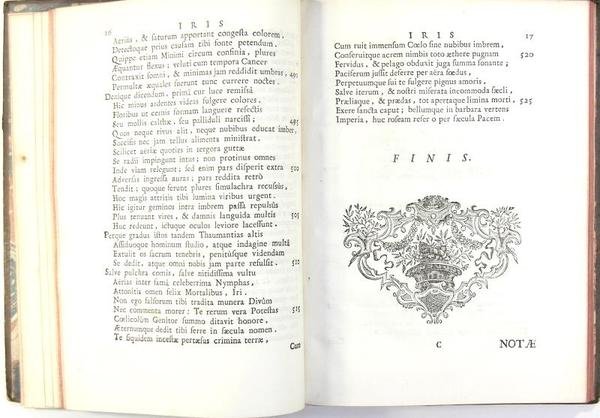 Palerarini Nicolaus et Marcus, Rome, 1747. Typographie Palladis. In/4, reliure du temps en plein veau moucheté, dos à nerfs à caissons dorés, tranches rouges, beaux culs-de-lampe, très beaux bandeaux, culs de lampes et lettrine historiée - 6 f., 128 pages, 2 planches dépliantes sur cuivre. Légers défauts en reliure : Reliure épidermée aux coins, sur les chasses et les coiffes, avec de légers manques sur les coiffes, le coin inférieur droit du premier plat et vers la chasse supérieure gauche du premier plat, mais excellent état des feuillets. « Poèmes sur l’Arc en Ciel et sur l’Aurore Boréale », suivis de commentaires scientifiques, complétés par les gravures. Carlo Noceti (v. 1695-1759), professeur de théologie puis examinateur des évêques à Rome. Bib : Journal des Savans, décembre 1748, p.1. Bibliothèque des écrivains de la Compagnie de Jésus, 1856, n°23. Bibliotheca Hulthemiana ou Catalogue méthodique de la riche et précieuse collection de livres et des manuscrits, n° 11762. 4to, in fullt contemporary spoted calf, ribed & gilt spine, red edges, nice and neat tail-pieces & historical letter, 2 folding plates. Flaws : wears on binding (corners worn), joints partially craked, but sheets in very good conditions and fresh.
