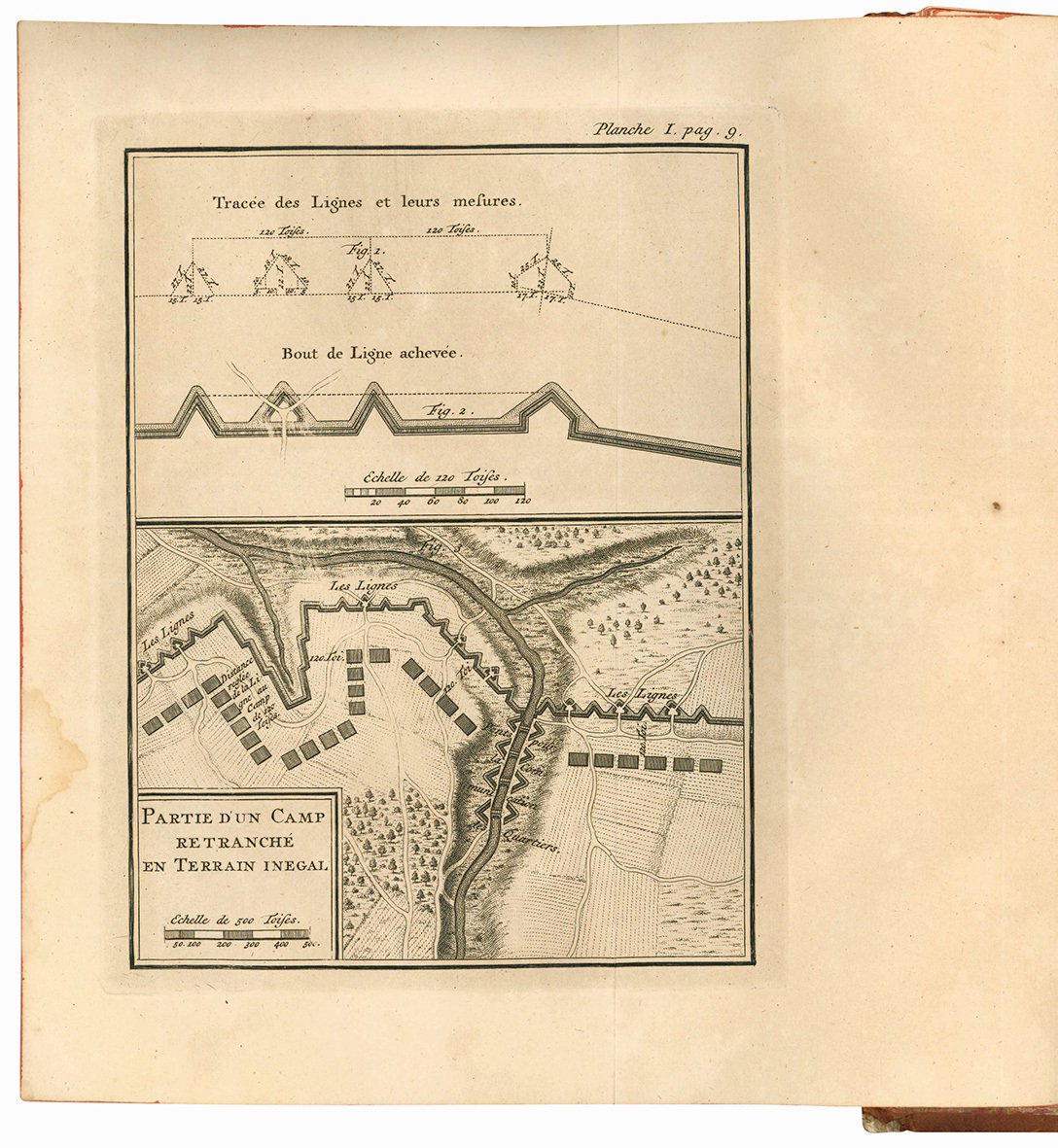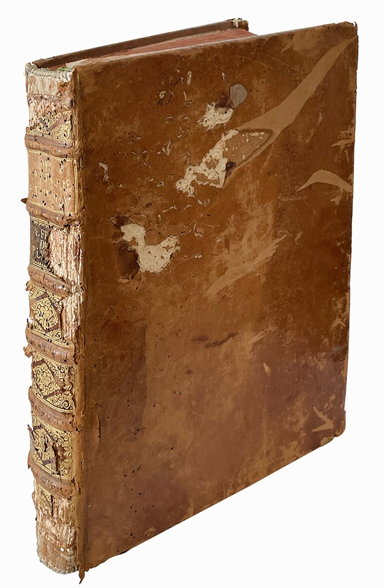 In 4to (mm 273x208); pp. [20], 216, XXXIII [i.e. XXXVI] c. di tav. calcografiche ripiegate fuori testo. Segnatura: *8 **2 A-Dd4. Frontespizio stampato in rosso e in nero con piccolo fregio xilografico, fregi xilografici. Nelle tavole sono raffigurate fortificazioni, esempi di attacchi, profili e schemi di costruzione. Carta leggermente ed uniformemente brunita. Piena pelle coeva con titolo in oro su doppio tassello al dorso. Dorso a sei nervetti riccamente decorato in oro. Tagli rossi. Pesanti mancanze al dorso; mancanze, abrasioni e segni di tarlo ai piatti.