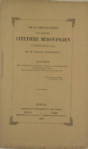 Evreux, Conremillot et Régimbart, 1855. Plaquette in-8 (23 x 14 cm) brochée en cahier cousu, 16 pages, 3 planches dépliantes in-fine. Charles Lenormant (Paris 1802 - Athènes 1859) archéologue, égyptologue et numismate français. Inspecteur des Beaux-Arts, il accompagne en 1828 Jean-François Champollion dans son voyage en Égypte. Il devient ensuite bibliothécaire à la Bibliothèque de l'Arsenal. Conservateur du Département des Imprimés en 1832, il est élu membre de l'Académie des inscriptions et belles-lettres en 1839 et, l'année suivante, prend la direction du Cabinet des médailles. Il obtient également la chaire d'archéologie du Collège de France en 1849.Cet érudit couvert d'honneurs se laissa vraissemblablement emporter par son imagination et son penchant de plus en plus prononcé pour le monde chrétien en publiant dès 1854 une plaquette sur sa découverte, puis en la rapportant devant la Société libre d'Agriculture, du département de l'Eure en 1855. Cette annonce fut vivement critiquée et la présente publication de 1855 (anonyme) - charge mettant en cause les résultats du rapport - fut l'objet de rééditions et augmentations en 1856 et 1858. La mort de Lenormant en 1859 ne fit pas cesser la polémique, sa défense fut ensuite assurée par son fils Fançois. Biblio : Manuel du Bibliographie Normand (p.322) pour les autres éditions.