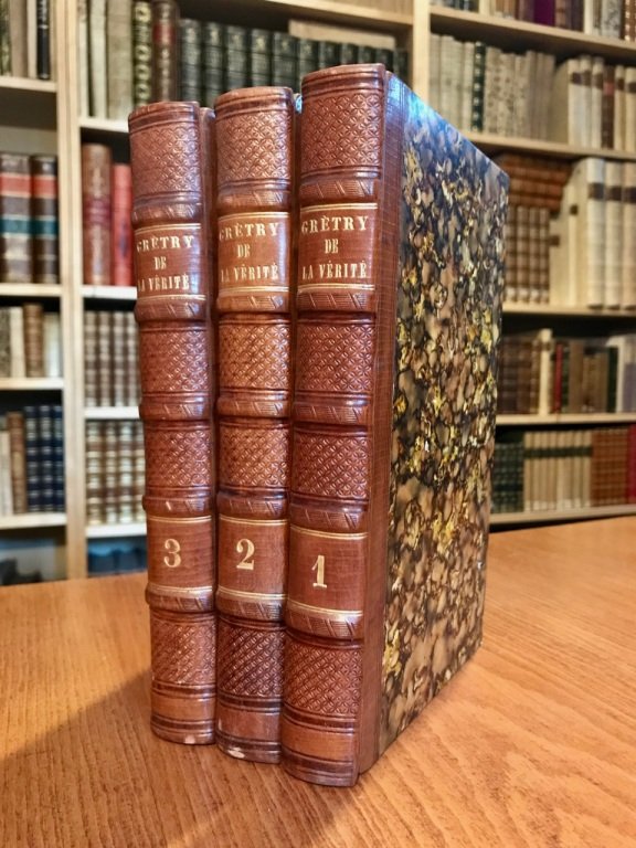 <span style="font-style: normal;">3 volumi in-8° (cm. 21), legature coeve in m. pelle e nervi, titolo e decorazioni in oro e a secco ai dorsi, piatti e risguardi marmorizzati; pp. CXLIV 248 [4], [4] 402 [6], [4] 412 [2] in buono stato e in barbe; sporadiche fioriture. Edizione originale del libro di riflessioni morali e politiche del noto compositore belga che fu grande cultore di Rousseau e amico degli enciclopedisti (qui tratta di educazione, donne, costumi, arte, politica, ecc.). Visse gli ultimi dieci anni di vita a Montmorency, nell'</span><i>ermitage&nbsp;</i>già residenza del filosofo da lui stimato. Ottimo esemplare. (SO2)