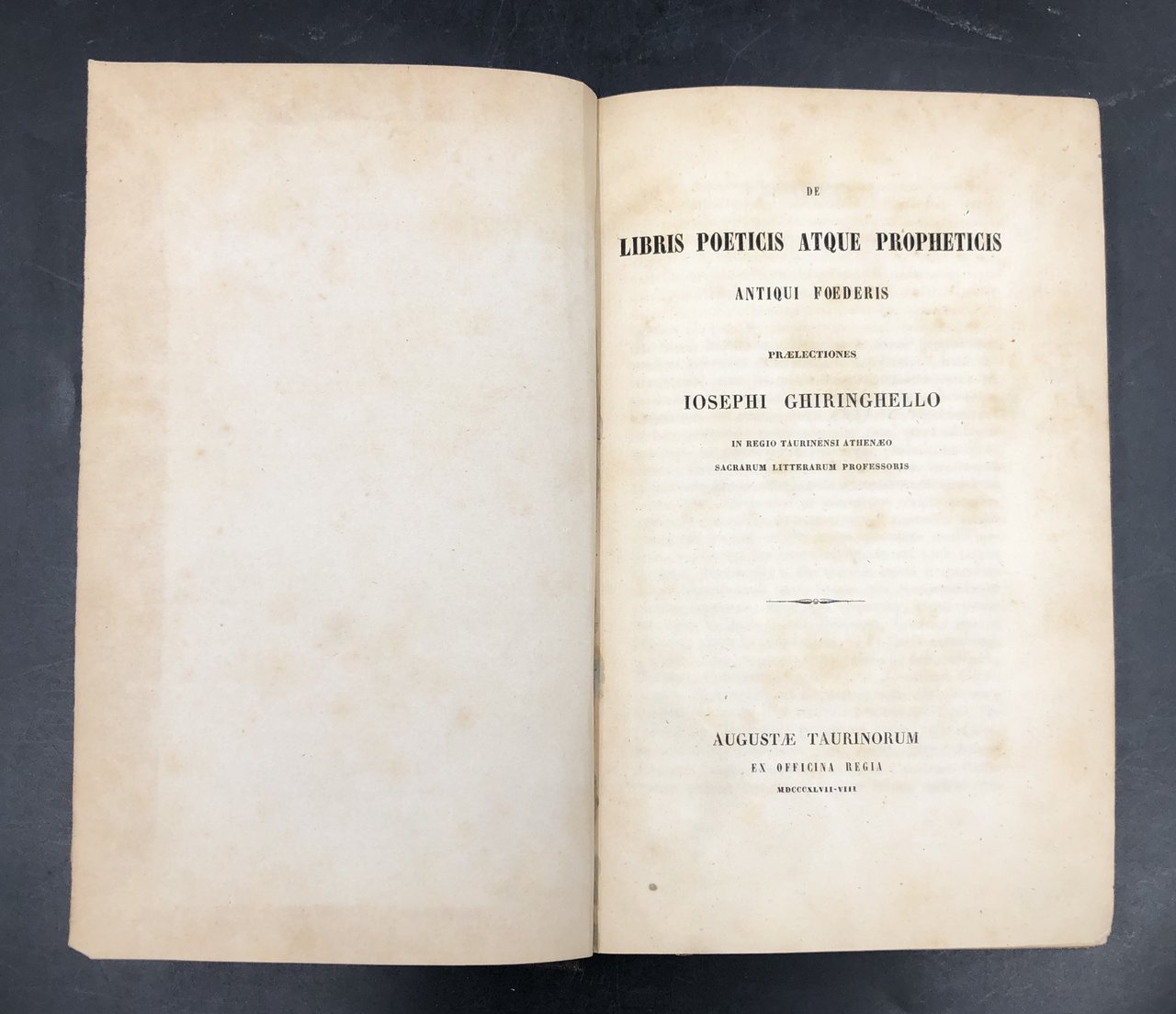 In-8° (cm. 21,2x13,5), pp. 501, (1). Bella mezza tela granulosa coeva, tit. oro al ds., carta decorata ai piatti; lievi usure presso le cuffie, ma solido. Ottimo l'interno. Numerose citazioni in ebraico, del dotto biblista GHIRINGHELLO, prof. di Sacra Scrittura nella facoltà teologica delluniversità di Torino; la sua biblioteca costituì uno dei più qualificati apporti '800 alla Biblioteca del Seminario. Lo stile o la cadenza poetica è di somma importanza in opere tramandate per generazioni per apprendimento e insegnamento mnemonico, prima che per iscritto. Di sicuro interesse per chi si debba occupare di poemi antichi o di poeti moderni come William Blake, non legati alla metrica ma alle cadenze. Non comune.