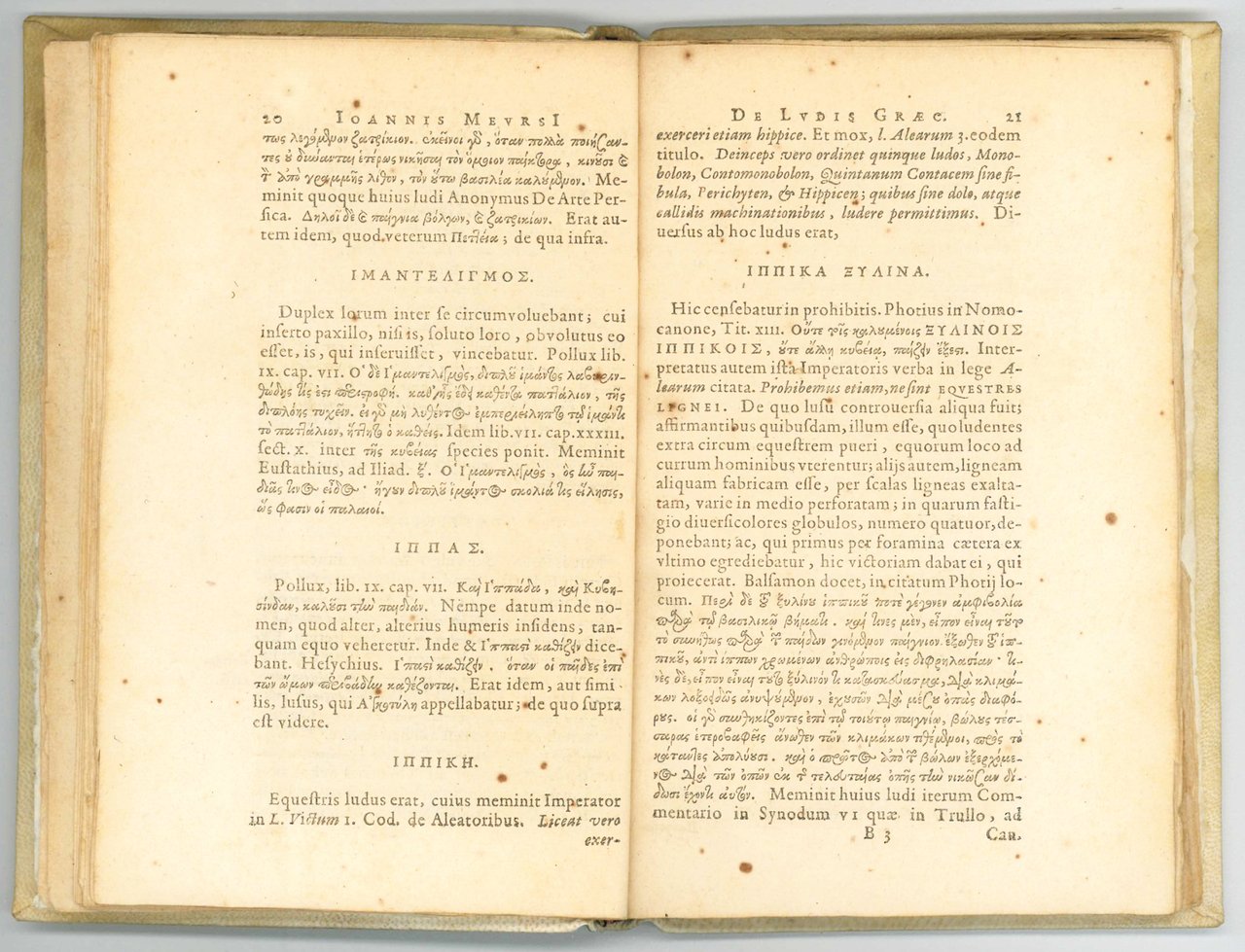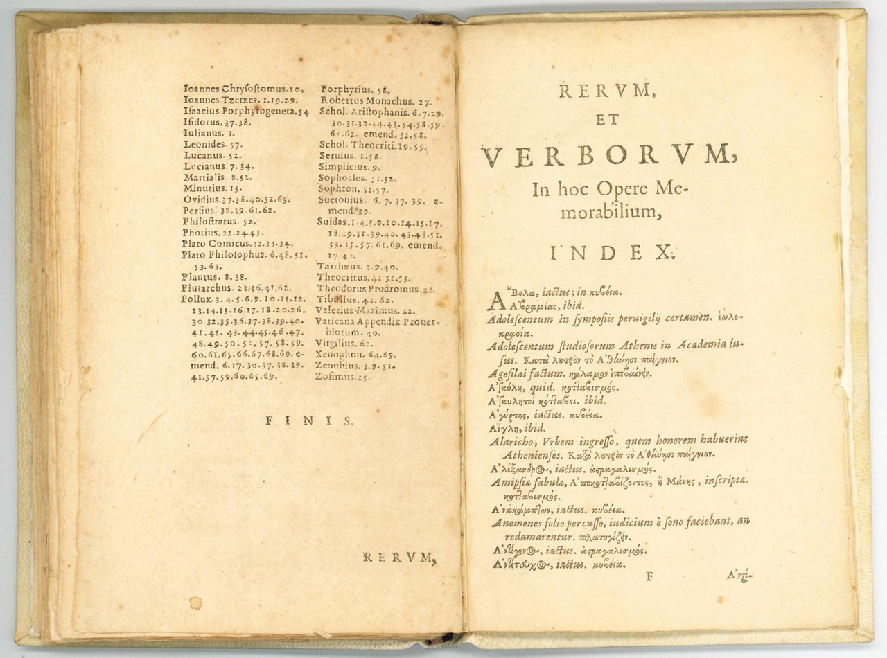 First edition of this work on Greek and Roman social games for kids and adults addressed to Pieter Schrijver (1576-1660). A second edition appeared in 1525 under the title Graecia ludibunda, with the addition of Daniel Souter's Palamedes, sive de tabula lusoria, alea et variis ludis (Leiden, Elzevier)