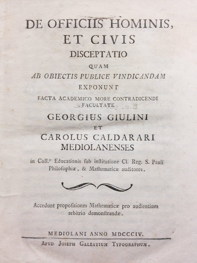 De officiis hominis, et civis disceptatio quam obiectis publice vindicandam exponunt [.]. Accedunt propositiones Mathematicae pro audientium arbitrio demonstrandae.