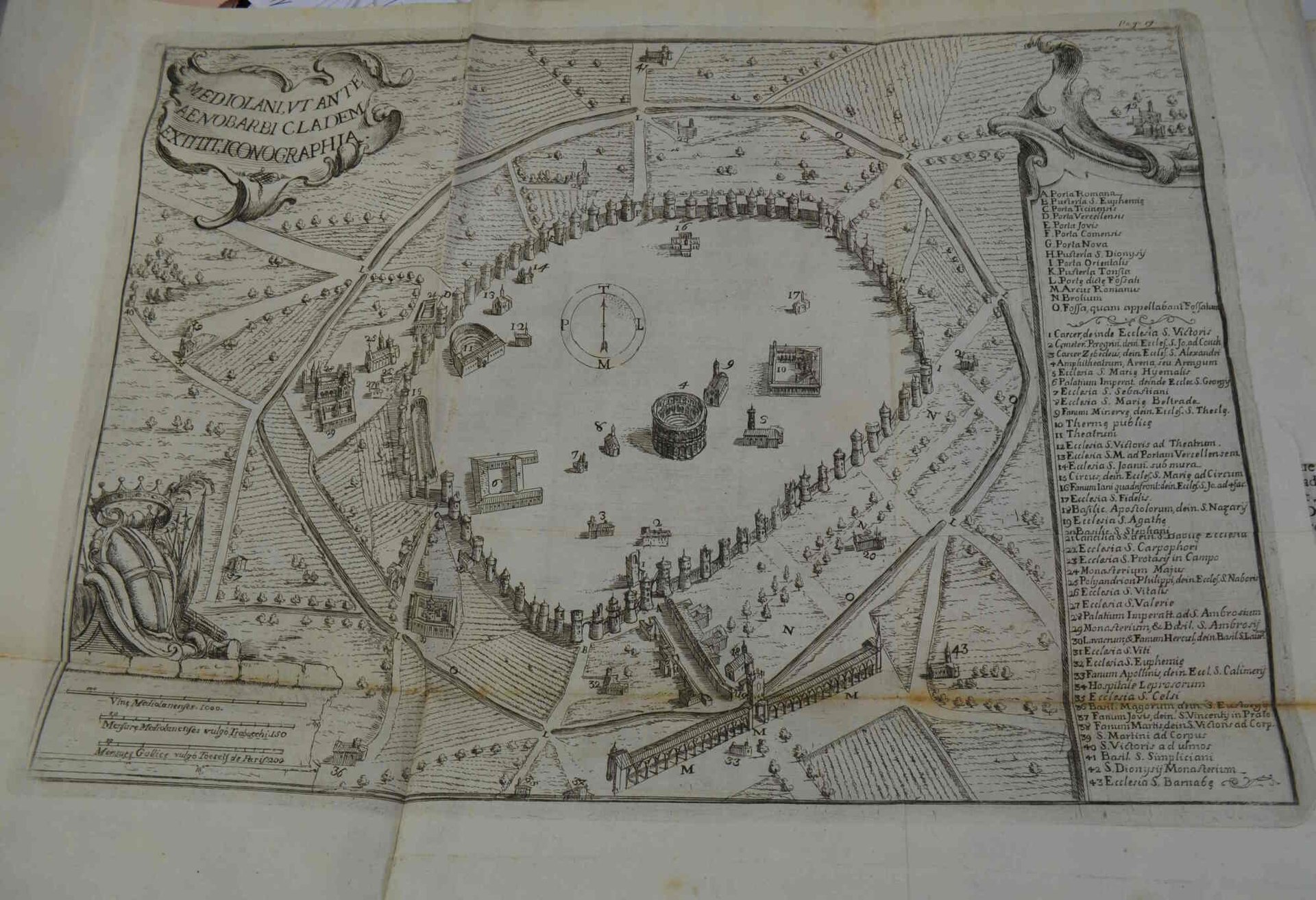 Cm. 26,5, pp. (22) 194 [recte 204] xxiv. Sono inoltre presenti 4 pp. in numeri romani poste fra le preliminari. Frontespizio in rosso e nero con grande incisione centrale, testate, capolettera e 20 (di 21!) tavole f.t. incise in rame (tra cui la grande pianta di Milano). Legatura del tempo in piena pergamena rigida. Qualche traccia d'uso esterna e purtroppo e mancante di una tavola a fronte di p. 160 con le figure numerate 18 e 19 (riprodotta in fotocopia). Edizione originale riguardante i monumenti più antichi di Milano (esistenti a Milano prima della distruzione del Barbarossa).