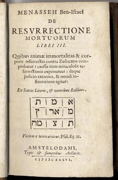 Prima edizione della più celebre opera dell’autorevole rabbino portoghese Menasseh, fondatore della prima tipografia ebraica nei Paesi Bassi, nella tollerante Amsterdam, e protagonista del fiorire della cultura politica e religiosa dell'area nel suo secolo d'oro. Scrisse questo trattato sull'immortalità dell'anima e la resurrezione dei morti nel giorno del Giudizio, basandosi su fonti tanto cristiane quanto ebraico-cabalistiche, platoniche ed esoteriche (Zoroastro e Trismegisto in particolare). In ragione di tale spiccato sincretismo, il De resurrectione incontrò la ferma opposizione delle gerarchie cattoliche e fu prontamente messo all'Indice. L'ultima pagina del paratesto iniziale presenta una curiosa lista dei libri ebraici disponibili in traduzione spagnola. Anche questo testo uscì in spagnolo sempre nel 1636 presso la tipografia dell’autore.