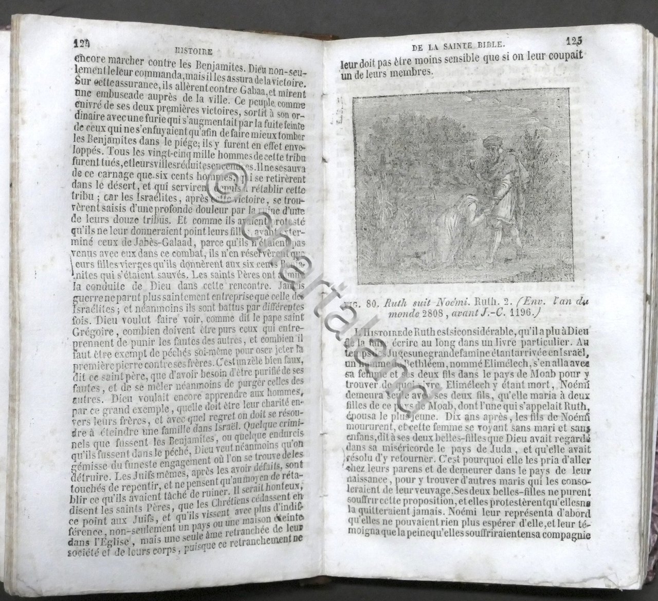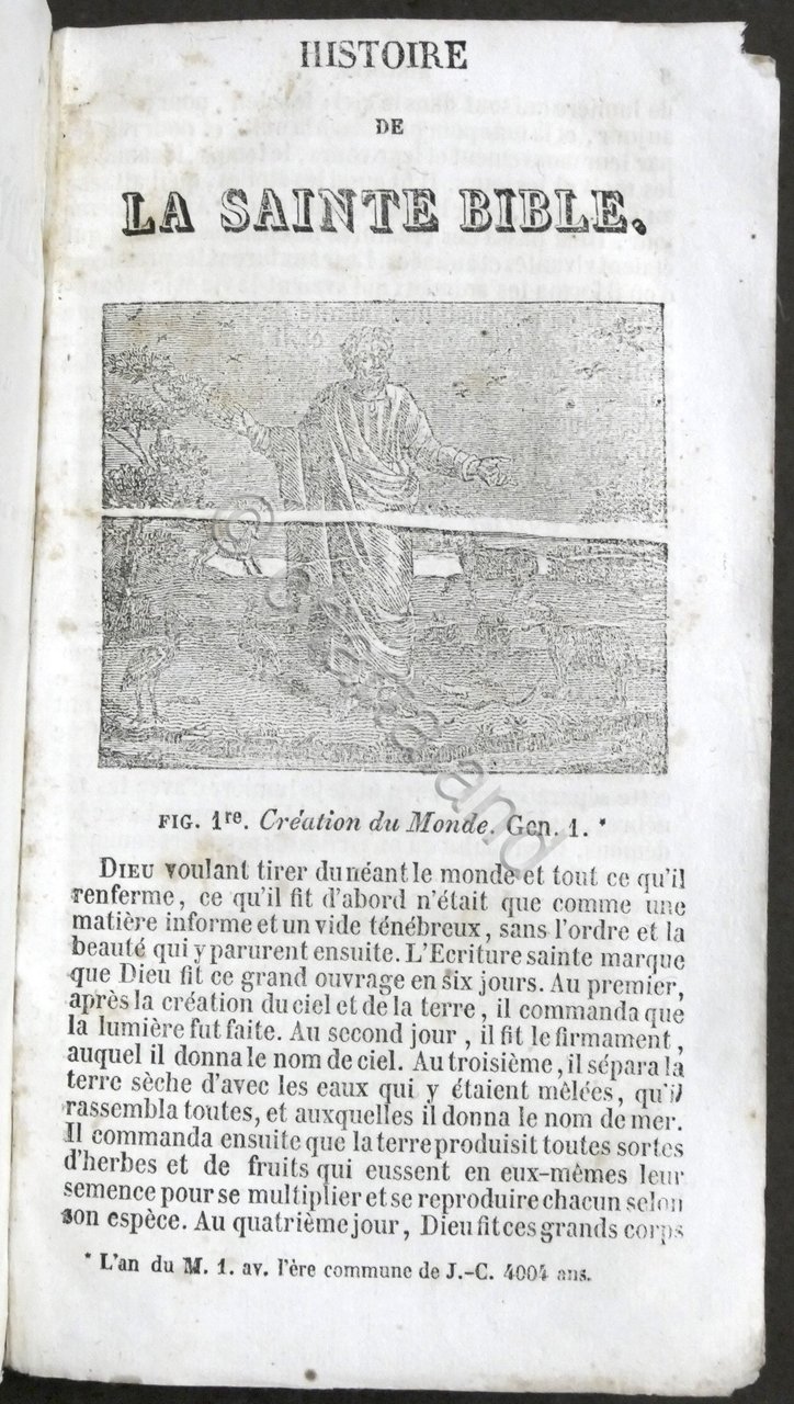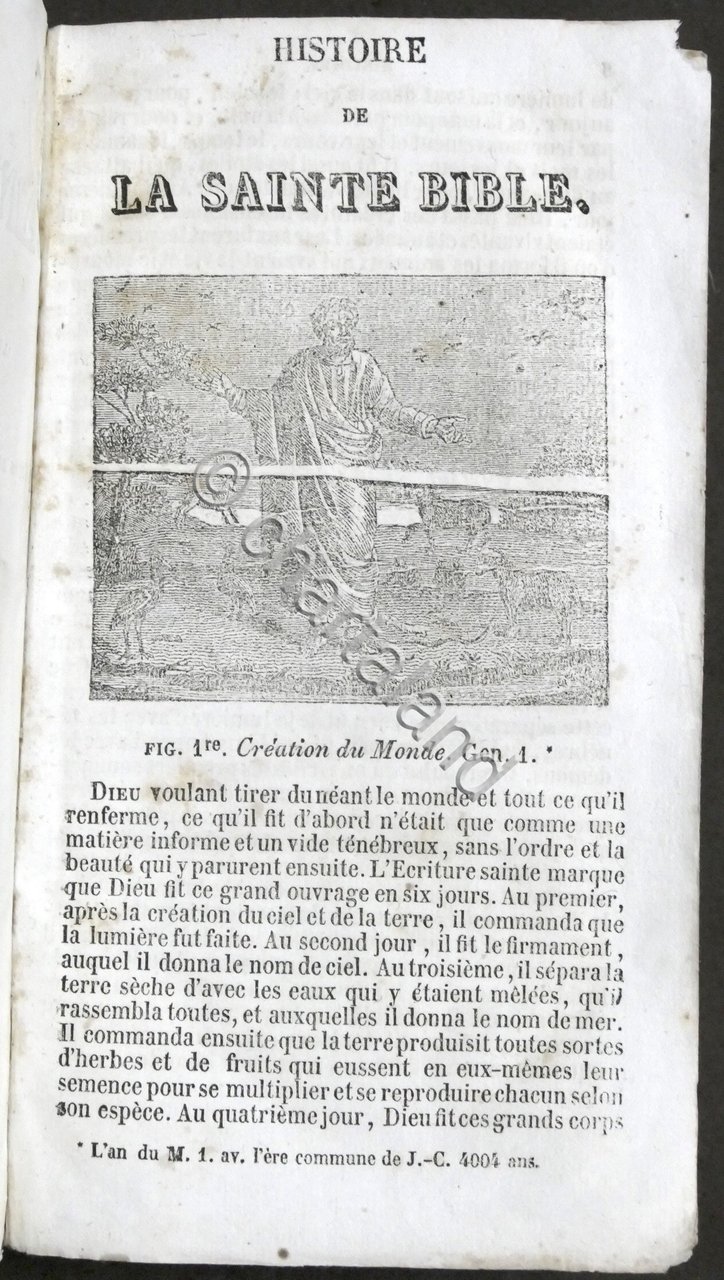 Histoire de la Sainte Bible, contenant le Vieux et le Nouveau Testament, avec des explications édifiantes tirées des Saints Peres, pour régler les moeurs dans toutes sortes de conditions par De Royaumont - ed. 1840 Pag. 396, con 24 figure Legatura in mezza pelle - Testo in francese. Condizioni generali buone. Qualche segno del tempo.