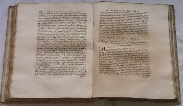 In 4. Dim. 28,5x22 cm. Pp. LVI+376. Rara prima edizione del 1752 di questa importante opera del sacerdote Daniele Concina (1686-1756). Concina era noto principalmente per il suo inflessibile rigore e per le sue orazioni energiche e spesso violente. Il suo intento era quello di un ritorno alla Chiesa delle origini. Questa opera formata da tre dissertazioni è una critica aperta alle rappresentazioni teatrali a causa della loro presunta influenza corruttrice dei costumi. Al verso dell'occhietto il testo di una lettera circolare di Papa Benedetto XIV datata 1 Gennaio 1748 agli arcivescovi e vescovi in latino ed in volgare nella quale egli attesta la tolleranza anche se di mala voglia per il divertimento carnevalesco. Tra gli argomenti trattati: storia degli spettacoli, la dottrina luterana, il pensiero di Paolo Segneri in merito, Pignatellli, Bellarmino, le donne in scena, la voluttà del teatro, la musica teatrale ecc. In buone condizioni. Copertina in cartonato coevo con titolo manoscritto al dorso in buone condizioni generali con lievi usure ai margini e dorso. Legatura in buone condizioni. All'interno le pagine si presentano in buone condizioni con rare fioriture e bruniture. Errore di legatura: pagina 313 legata tra le pagine 315 e 317. In barbe. Scarce first edition of 1752 of this important work by the priest Daniele Concina (1686-1756). Concina was mainly famous for his severe carachter and his energic and violent orations.<BR>His intention was a return to the Church of the origins. This work is made up of three dissertations and it is an open critic to theatral representations due to their corructive influence on costumes In the title page the text of a circular letter of the Pope Benedetto XIV dated 1 of January 1748 to bishops in latin and italian language in which he states the tollerance for the carnival funny. In good conditions. Carton coeval cover with manuscripted title in the spine in good general conditions slightly worn in the edges and spine. Binding in good conditions. Inside pages are in good conditions with occasional foxings and yellowings. Fault in binding: page 313 bound between pages 315 and 317. In barbe.