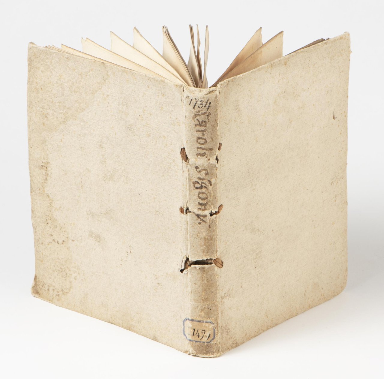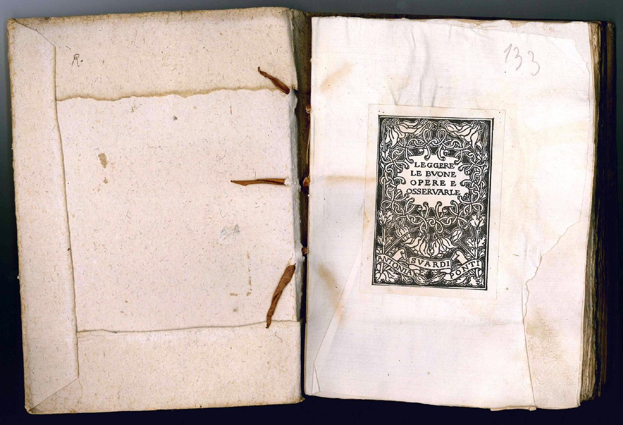 In 4to (mm. 220x158). Cc. [4], 123, [1]. Segnatura: +4 A-Z4 Aa-Hh4. Le carte +4 e Hh4 sono bianche. Marca tipografica al titolo. Cartone coevo cucito alla rustica, sul dorso titolo manoscritto e segnature di mano posteriore “1734” e, su etichetta, “1494”. Al risguardo libero anteriore ex-libris inciso di Antonia Suardi Ponti. Alcuni fascicoli un po' bruniti, fioriture marginali sparse, volume un po' sciolto e parzialmente staccato dalla legatura. Eccezionale esemplare interamente a fogli chiusi.