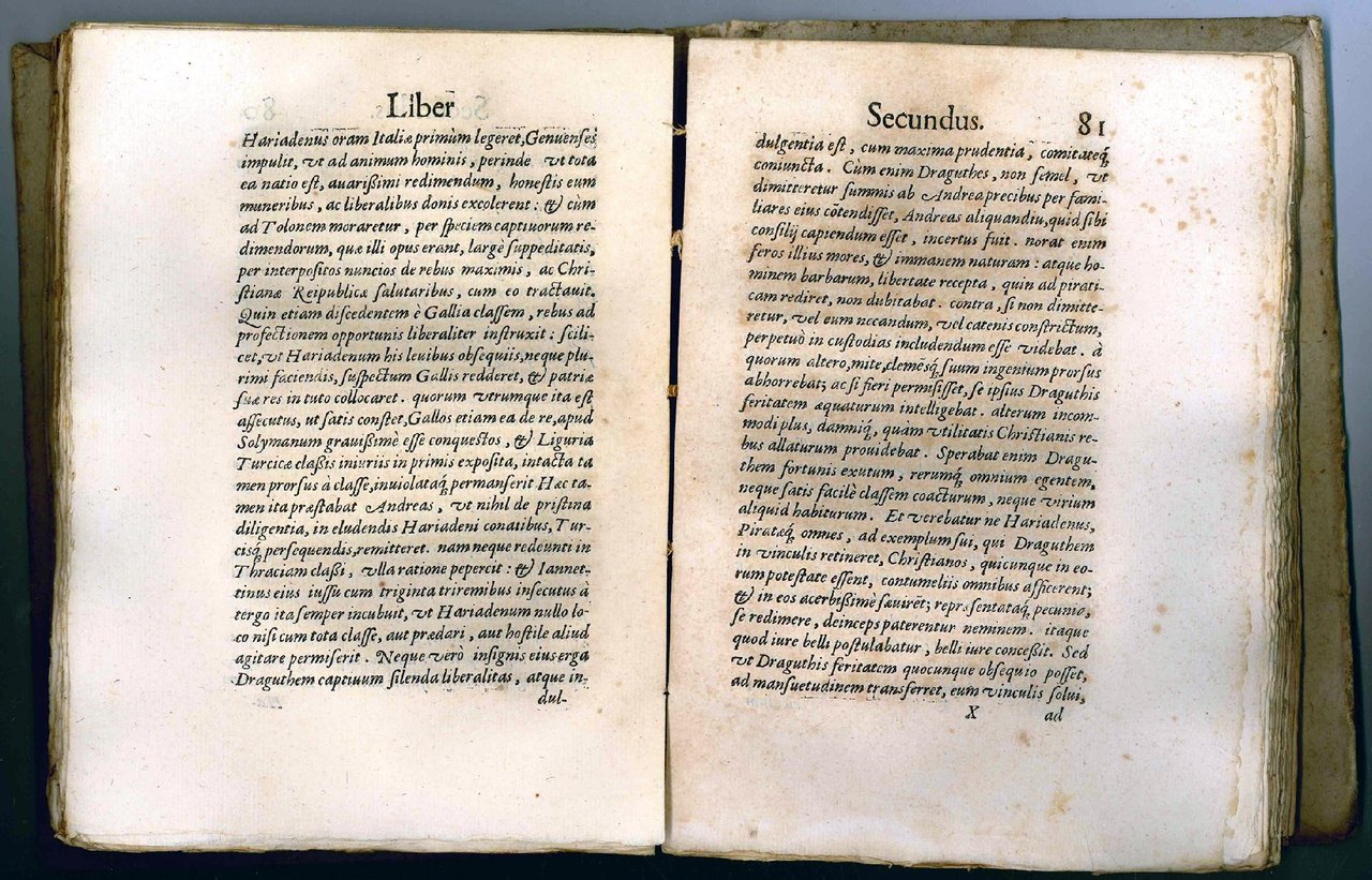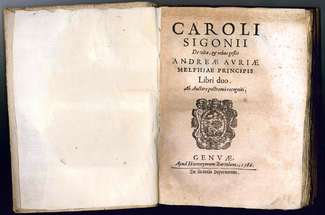 PRIMA EDIZIONE in latino (una traduzione in italiano apparve a Genova nel 1598), pubblicata postuma, della prima biografia dedicata al grande condottiero ed ammiraglio genovese Andrea Doria (1466-1560), il quale per conto dell'imperatore Carlo V combatté contro il re di Francia Francesco I e comandò diverse spedizioni contro i Turchi tra il 1530 e il 1541.