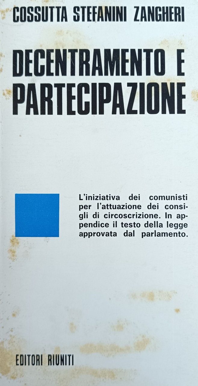 L'iniziativa dei comunisti per l'attuazione dei consigli di circoscrizione. In appendice il testo della legge approvata del parlamento. in ottavo leg. bross. pp. 114 Buono (Good) Buon es. ma con segni del tempo.