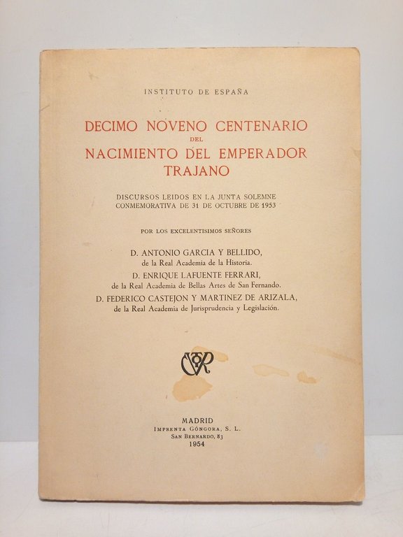 Décimo noveno Centenario del nacimiento del Emperador Trajano ( Instituto de España. Discursos leidos en la Junta Solemne Conmemorativa de 31 de Octubre de 1953)