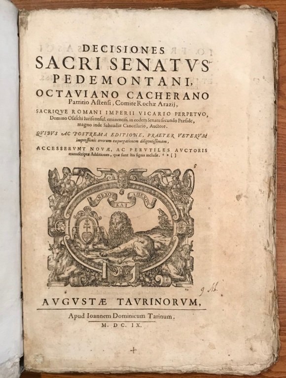<span style="font-style: normal;">In-folio reale (cm. 39,5), legatura coeva in cartonato d'attesa con titolo ms. al dorso (usure al dorso); cc. 224 [24] in barbe, con vignetta silografica al </span><i>recto</i> del frontespizio e ritratto silografico del Cacherano al <i>verso</i>; alla c. 219 inizia con proprio frontespizio datato 1608 la <i>Disputatio an principi christiano fas sit pro sui</i> [.]. Titolo anticamente manoscritto su lingua cartacea applicata al risguardo e leggibile col volume appoggiato di piatto; l<span style="font-size: 10pt;">eggere bruniture e qualche fioritura. Ristampa seicentesca della raccolta, interessante contributo giuridico alla formazione dello stato sabaudo. Esemplare molto buono.</span>
