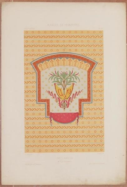Bella cromolitografia del 1866 circa tratta dal "Journal manuel de peintures appliques a la decoration" diretto da Pierre Chabat per la decorazione di interni. L'incisione mostra una decorazione. In buone condizioni. TECNICA: Cromolitografia AUTORE: Dupuis DIMENSIONI FOGLIO: cm 46x31,5 DIMENSIONI INCISIONE: cm 30,5x20 EPOCA: 1866 circa CONDIZIONI: Buone condizioni, qualche fioritura e strappo marginale. Beautiful chromolythography of 1866 circa taken from the "Journal manuel de peintures appliques a la decoration" directed by Pierre Chabat for internal decoration. The planche shows a decoration. In good conditions. TECHNIQUE: Chromolytography AUTHOR: Dupuis PAGE SIZE: cm 46x31,5 PRINT'S SIZE: cm 30,5x20 PERIOD: 1866 circa CONDITION: good conditions with some foxings and tears in the edges