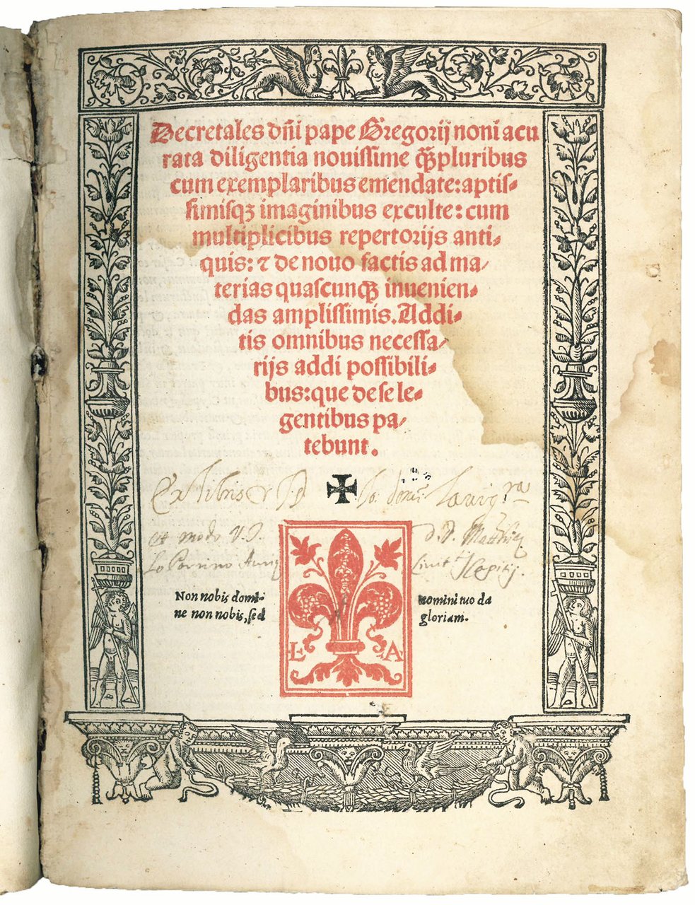 Decretales domini pape Gregorij noni acurata, diligentia nouissime quam pluribus cum exemplaribus emendate: aptissimisque imaginibus exculte: cum multiplicibus repertorijs antiquis: & de nouo factis ad materias quascunque inueniendas amplissimis. Additis omnibus necessarijs addi possibilibus: que de se legentibus patebunt. Venetijs, in edibus Luce Antonij de Giunta florentini, 1514 die XX Maij