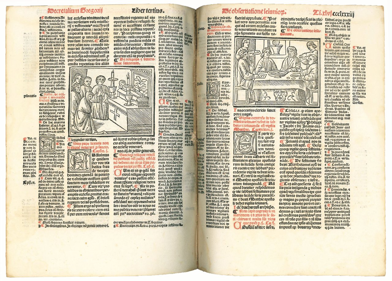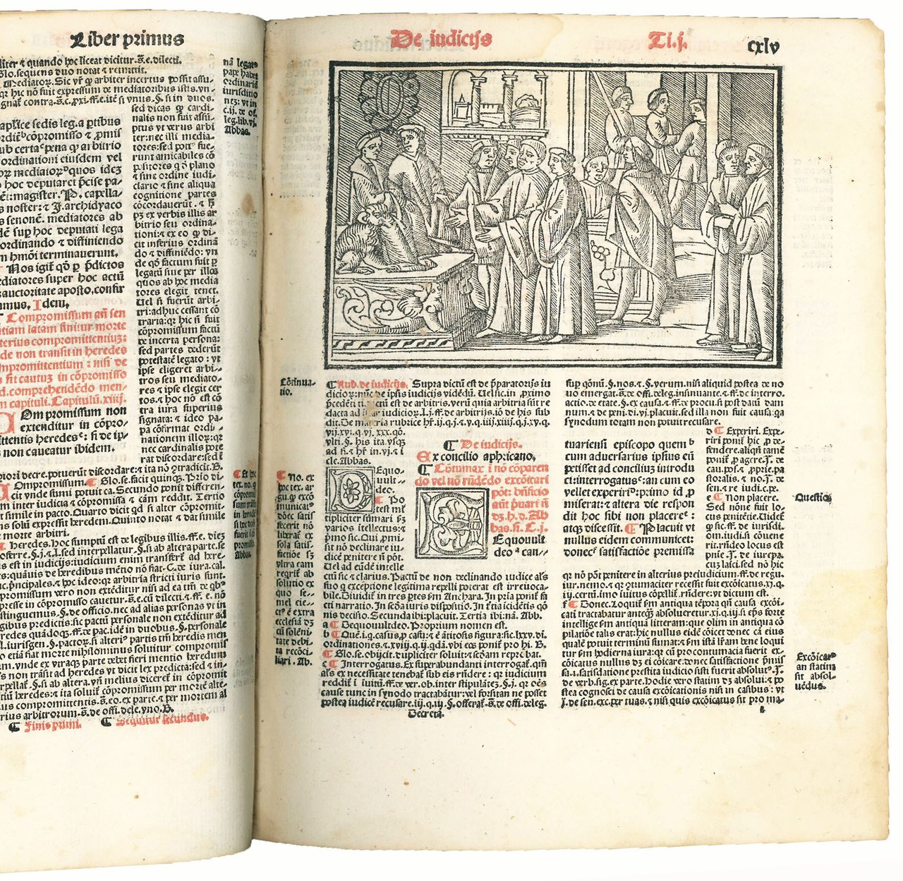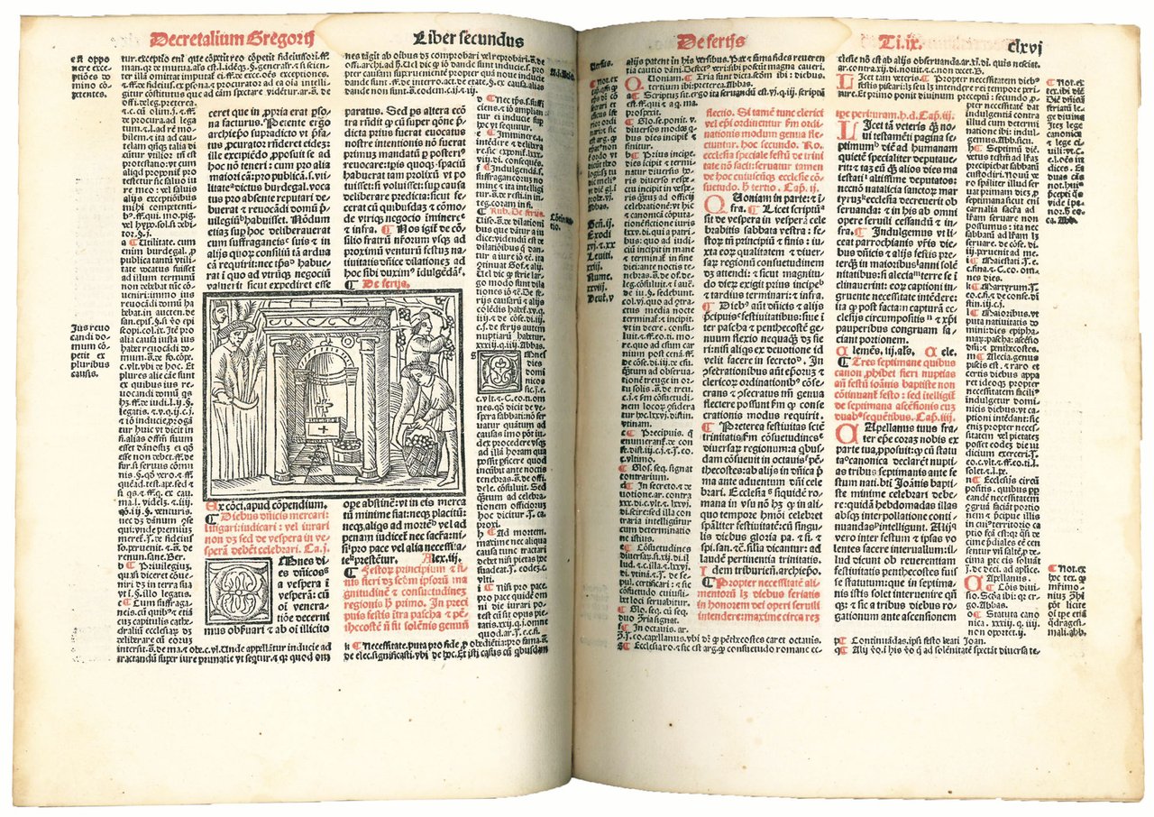Early 16th-century illustrated edition of Pope Gregory IX's Decretales (written in 1234), also known as the Liber extra. This edition, published by Giunta as volume two of the Corpus Iuris canonici and accompanied by the Glossa Ordinaria of the canonist Bernardo Bottoni, is arranged in five books on church government, procedure, clerical life, marriage and criminal law. Gregory's Decretales is a fundamental source of medieval Catholic canon law, part of the Corpus Iuris canonici (until 1917). It is a collection of constitutions, papal letters and conciliar canons. It was realised by the Dominican jurist St. Raymond of Penyafort to replace and update the Decretum Gratiani written in 1050.