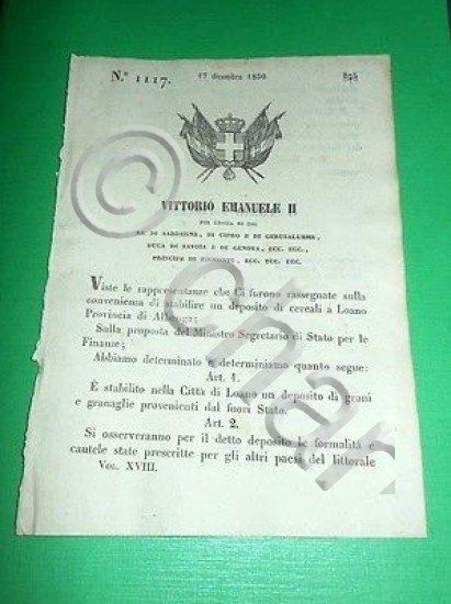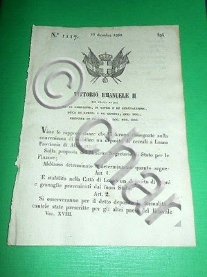 *** Atti del Governo di S. M. il Re di Sardegna: "E stabilito nella Città di Loano un deposito di grani e granaglie provenienti dal fuori Stato ..."Torino, 17 Dicembre 1850. Pagine 2.Per appassionati studiosi e collezionisti