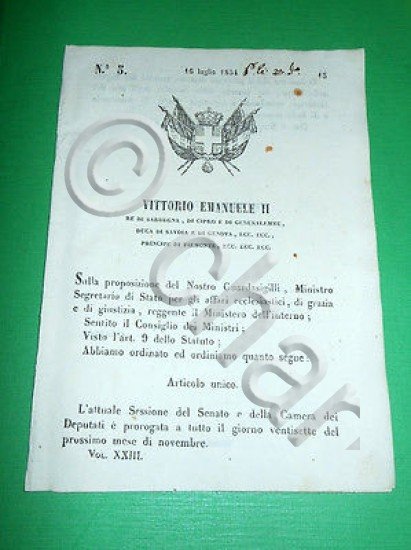 *** Atti del Governo di S. M. il Re di Sardegna: "L'attuale Sessione del Senato e della Camera dei Deputati è prorogata a tutto il giorno 27 del prossimo mese di novembre ..."Torino, 16 Luglio 1854. Pagine 2.Per appassionati studiosi e collezionisti