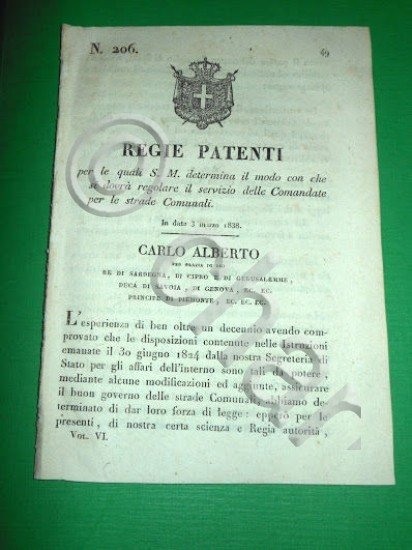 Decreti Regno Sardegna Torino Regie Patenti Comandate per le strade Comunali 838