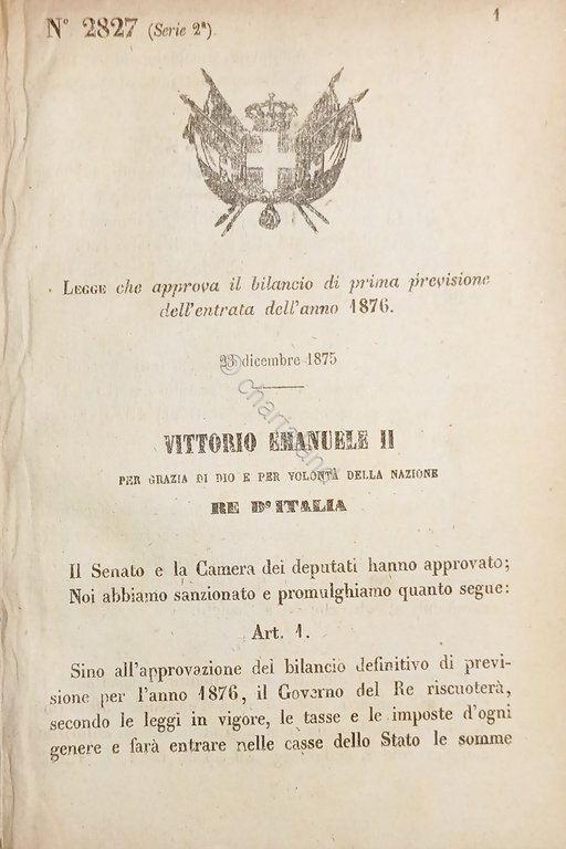Legge che approva il bilancio di prima previsione dell'entrata dell'anno 1876 - 1875 Decreto № 2827 Pagine 12 Condizioni buone come da foto