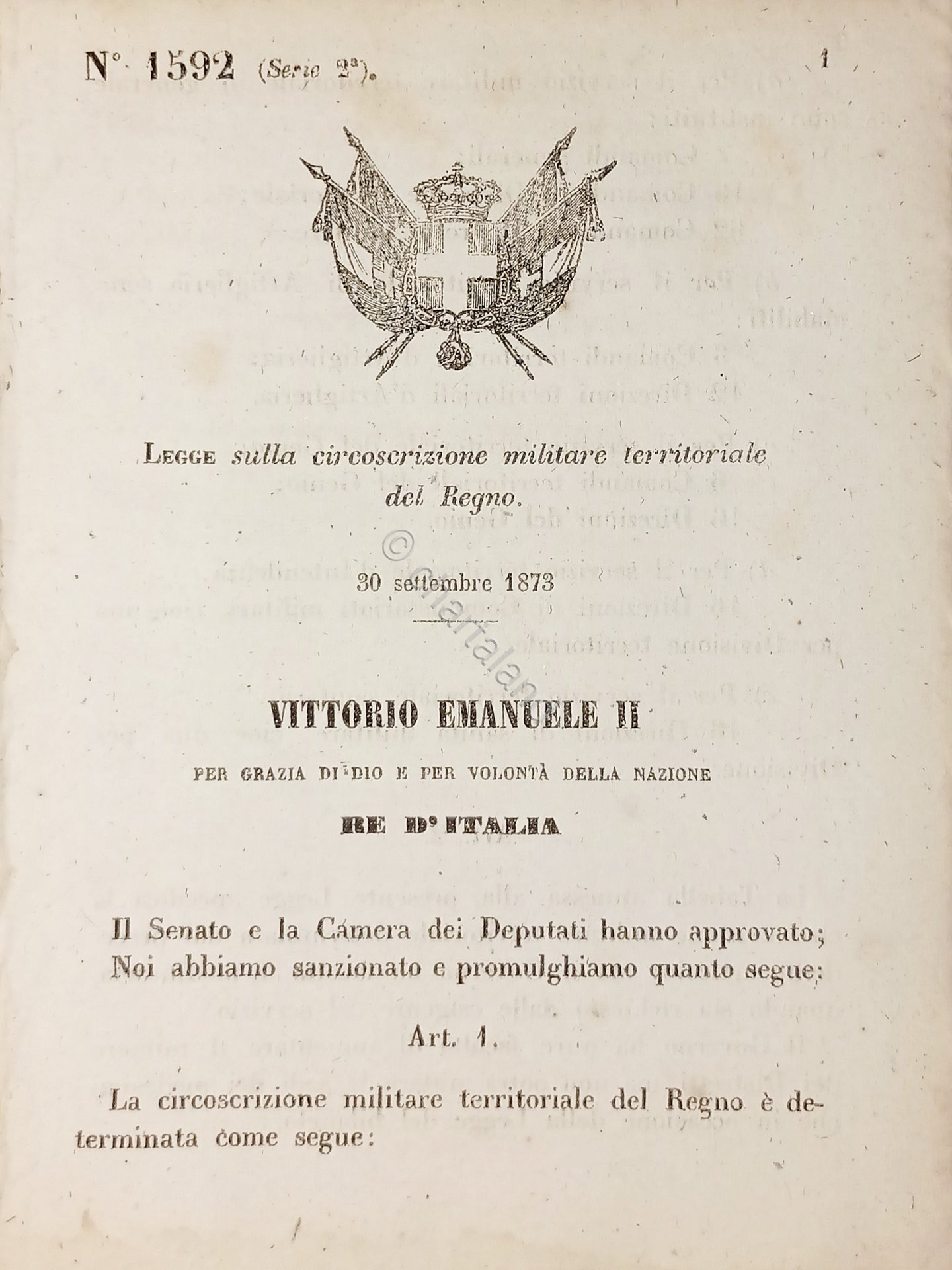 Legge sulla circoscrizione militare territoriale del Regno - 1873 Decreto № 1592 Pagine 7 Condizioni buone come da foto